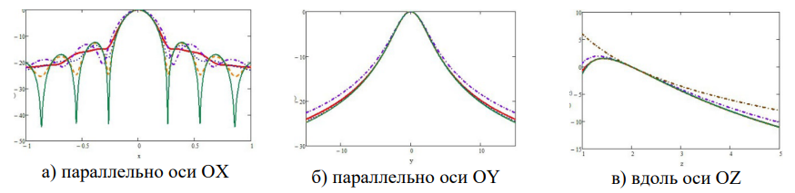 Как видно из графиков осевых распределений энергии, сфокусированным широкополосным электромагнитным полям свойственно хорошее совпадение значений в точке фокусировки и ее окрестности, а также эффект «заплывания нулей», приводящий к сглаживанию боковых лепестков. Для фокусировки в режиме концентрации энергии также характерно смещение максимума энергии поля в направлении к дискретной антенне, как и для сфокусированных монохроматических полей.
