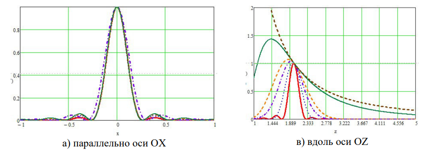 В таблицах 2 и 3 приведены поперечный и продольный размеры области фокусировки.