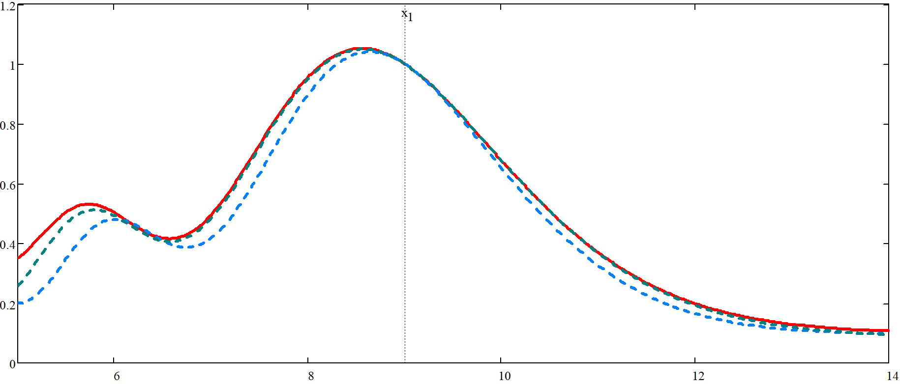 Рассмотрим формирование двух максимумов энергии электромагнитного поля, сформированных на одной прямой вдоль направления излучения. На рисунке 7 представлено распределение энергии электромагнитного поля в продольном направлении, сфокусированного в точках х1 = 3 м и х2 = 6 м, синим цветом обозначено поле на частоте f2, зеленым цветом — поле на частоте f1 и красным — суммарное распределение поля в заданной области.
