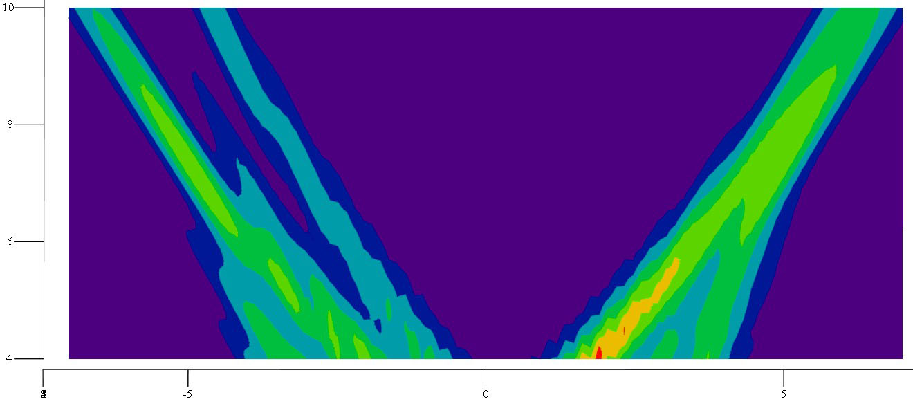 Рис. 6. Пространственное распределение энергии электромагнитного поля при расстоянии между точками фокусировки 6 м