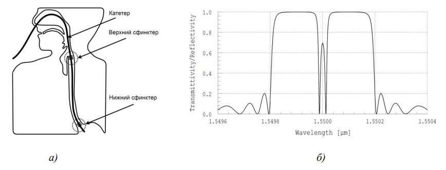 Рис. 1. Схема установки малосенсорного катетера (а) и спектральная характеристика используемых в катетере А-ВБР (б)