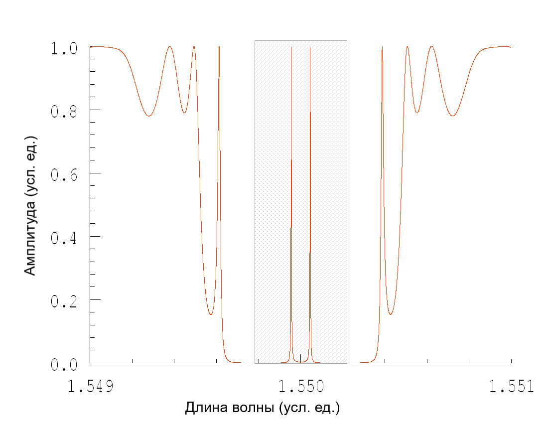 Рис.2. Спектр прохождения для А-ВБР с двумя дискретными фазовыми π‑сдвигами. Заштрихованной областью на спектре обозначена часть излучения, поступающая на фотоприемник
