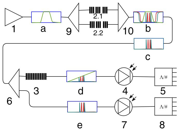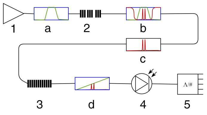 Широкополосный лазерный источник – 1 формирует широкополосное непрерывное лазерное излучение, которое проходит через А‑ВБР – 2 с формированием двухчастотного непрерывного лазерного излучения (с), которое, проходя через фильтр с наклонной АЧХ – 3, образует двухчастотное лазерное излучение (d) с модифицированными амплитудами. Полученное излучение принимается на фотоприемнике – 4, оцифровывается на АЦП – 5, и обрабатывается в блоке обработки цифрового сигнала, который на схеме не показан.