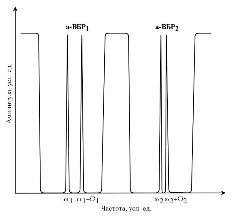 Разнос центральных частот А-ВБР между собой на значительное расстояние (свыше 1,0–1,2 ТГц) при полной ширине А-ВБР на половине высоты (0,3–0,54ТГц) и адресных частотах до 40 ГГц, позволяет избежать коллизий, связанных с возникновением в (16) совпадающих частот с адресными.