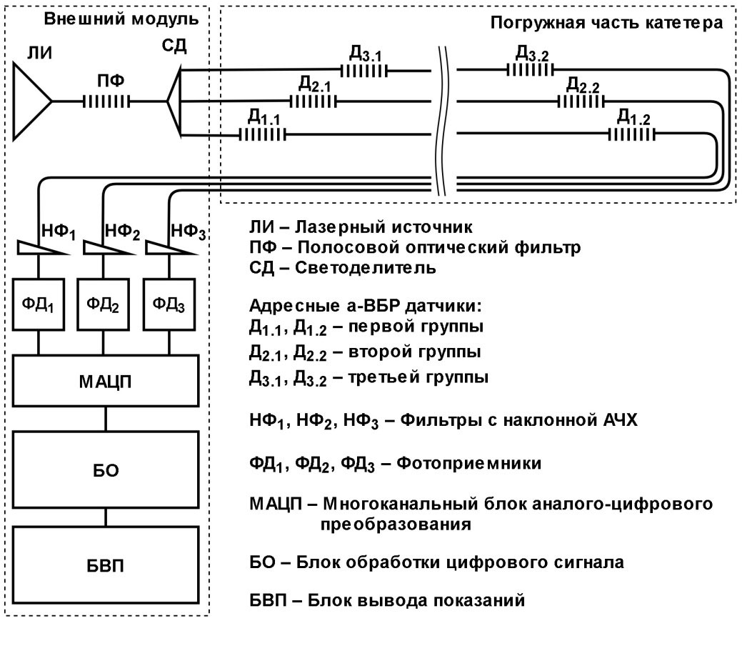 На рисункеРис. 9 приведена оптико-электронная схема катетера высокого разрешения, включающего в себя внешний модуль и погружную часть зонда с датчиками. Датчики объединены в две группы по месту их расположения – три на одном конце зонда, три на другом и в три группы по топологии их подключения.