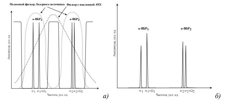 Рис. 10,б. Причем, выполнение требования исключения совпадения перекрестных частот адресным частотам А-ВБР позволяет обеспечить не только непересечение спектров А-ВБР1 и А-ВБР2, но и гарантировать то, что расстояние между ними всегда будет больше любой из адресных частот, входящих в оптический измерительный канал.