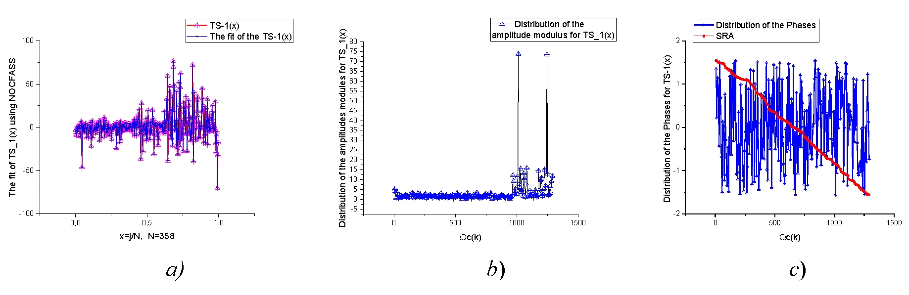 Fig. 3. The fit of the initial signal TS_0(x), realized in the frame of the NOCFASS: (a) we demonstrate the fit of TS_0(x) realized with exceptional accuracy (Rel.err = 10-14 %); (b) we show the modulus amplitude distribution for this TS; c) we show the phase distribution Phk=tan-1(Ask/Ack). The solid red line shows the sequence of the range amplitudes (SRA). As one can see from this figure it is expressed by the segment of the stright line. It means that the phase distribution Phk coincides practically with uniform distribution