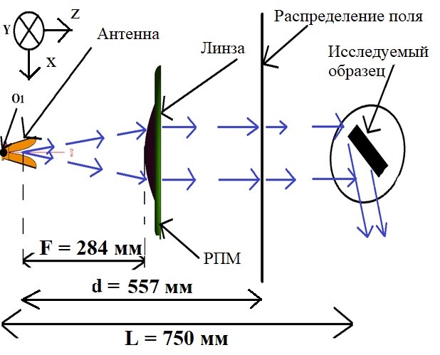 Рисунок 6. Схема моделирования эксперимента по измерению МКО с помощью антенны с корректирующей линзой