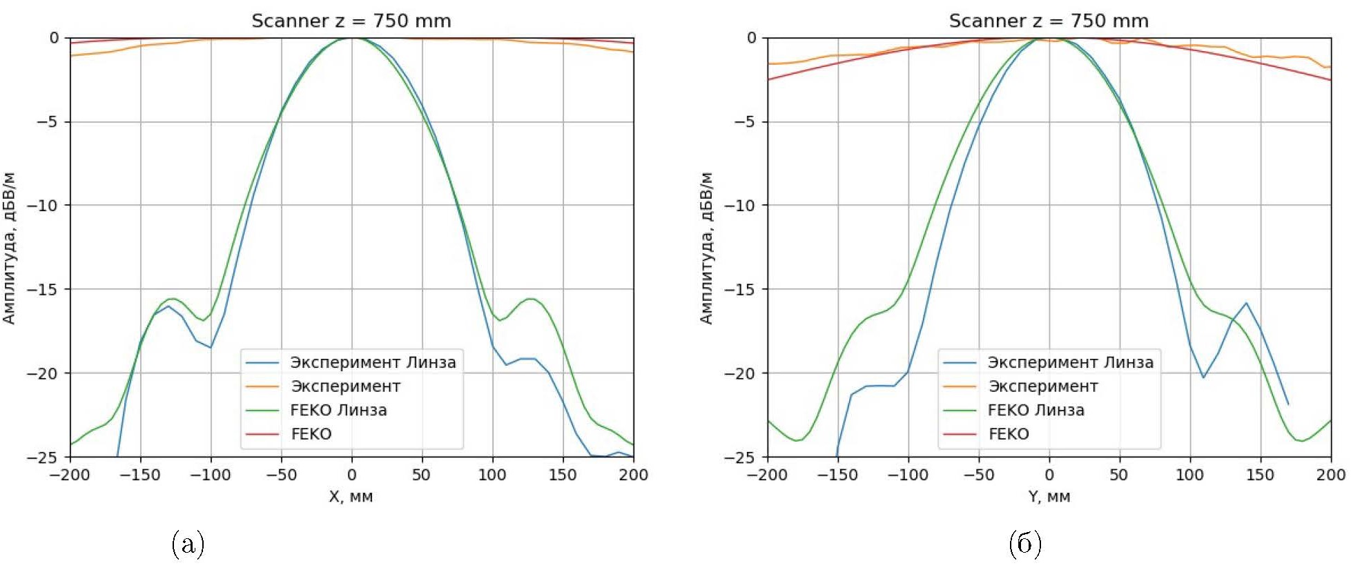 Рисунок 3. Графики зависимости распределения амплитуды ближнего поля, а) H-плоскость, б) E-плоскость, L= 750 мм, 10 ГГц