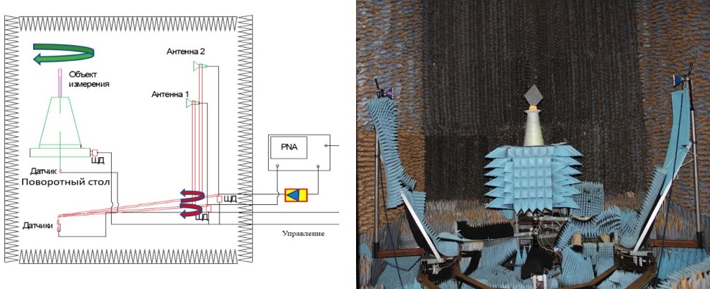Бистатический стенд [22] для измерений МКО находится в безэховой камере и состоит из опорно-поворотного устройства, на котором располагается объект исследования, двух приёмно-передающих антенн, установленных на поворотных тележках, которые перемещаются в диапазоне углов 10–85°. Радиус вращения антенн при измерении в квазиплоском поле равен 2 м (рисунок 4).