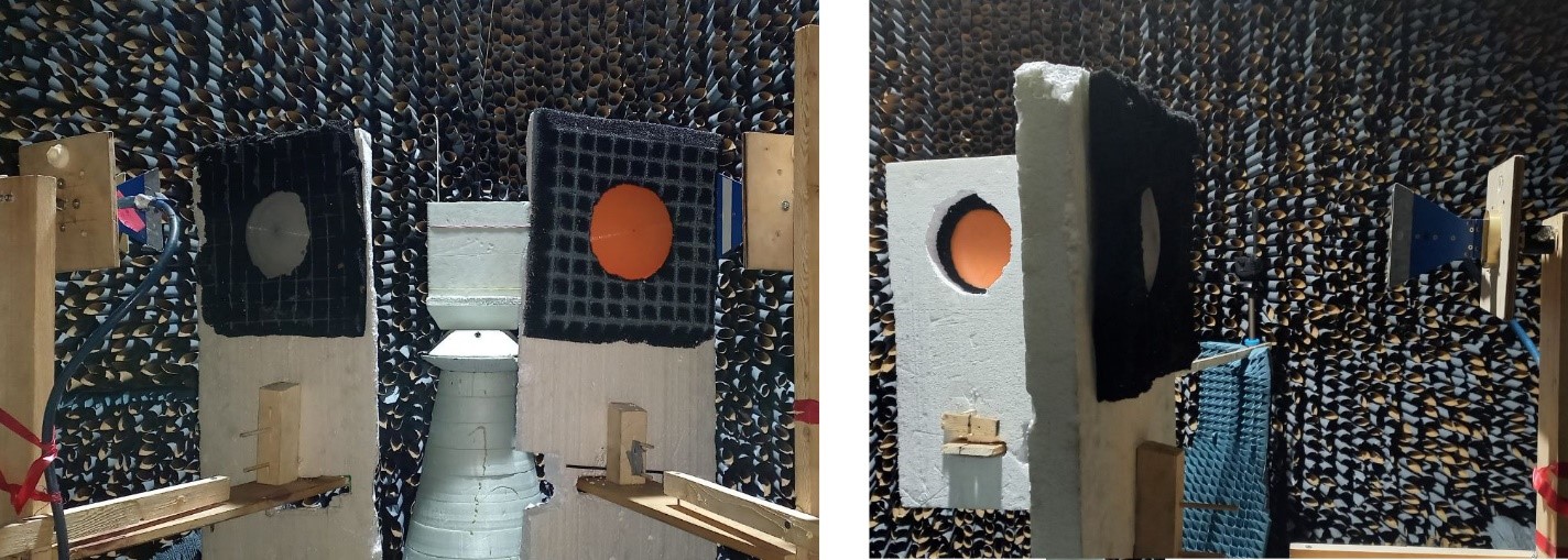 При проведении измерений с помощью антенн с корректирующими линзами радиус вращения антенн составляет 950 мм. Радиус вращения антенн с корректирующими линзами выбран таким образом, чтобы обеспечить проведение измерения МКО при минимальном угле в 15°. Антенны с корректирующими линзами жестко связаны с тележками с помощью дополнительно установленных балок. Антенны с корректирующими линзами перемещаются в диапазоне углов 15–85°. Каждая линза установлена в проем радиопрозрачного экрана из пенопласта, который фиксируется на балке. Вокруг линз размещены диафрагмы из РПМ для устранения боковых лепестков диаграммы направленности, близких к главному лепестку. На рисунке 5 изображены антенны с корректирующими линзами, интегрированные в измерительный стенд.