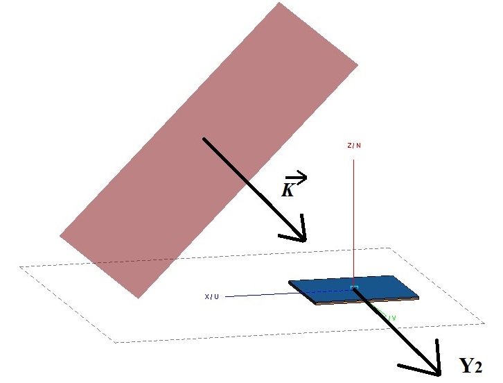 - На рисунке 6 изображена схема облучения исследуемого объекта. Источник излучения (область пространства, содержащая ближнее поле антенны) вращается вокруг оси . Волновой вектор излучения, k, направлен перпендикулярно плоскости, содержащей распределение ближнего поля антенны, вдоль радиуса вращения антенны. Такая схема эквивалентна повороту антенны вокруг центра исследуемого объекта по дуге окружности радиусом 750 мм. В качестве исследуемого образца выступает либо образец с материалом, либо металлическая пластина такого же размера. Результат рассчитывался в дальней зоне.