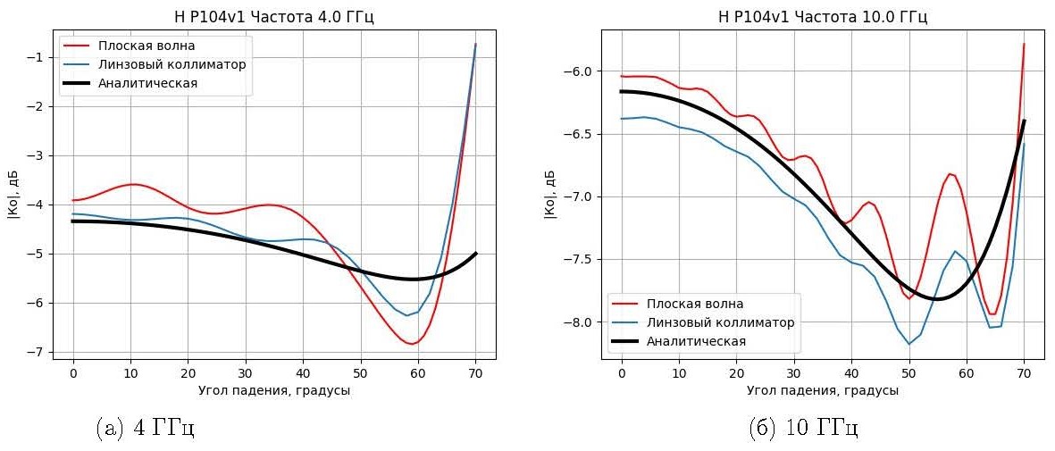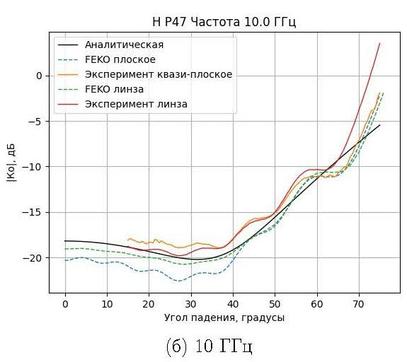 Исследуемый материал имеет интерференционный минимум (толщинный резонанс) в близи частоты 10 ГГц, поэтому в верхней части исследуемого диапазона сами значения коэффициента отражения существенно меньше. На графиках, представленных на рисунке 8б), имеются более сильные отличия между результатами численных расчетов и эксперимента в плоском поле. Имеющиеся отличия между экспериментальными и расчетными кривыми в резонансной области могут быть связаны с неточностью определения материальных параметров образца. Вблизи резонанса небольшое изменение в параметрах влечет сильное изменение в коэффициенте отражения. Отличия между результатами численных расчетов и аналитической кривой определяют методическую погрешность, которая составляет дБ для плоского поля и дБ при использовании линзы. С учетом таких методических погрешностей экспериментальные кривые описывают представленную аналитическую кривую. Результаты при использовании линзы лежат, очевидно, ближе к аналитической кривой, чем результаты для плоского поля.