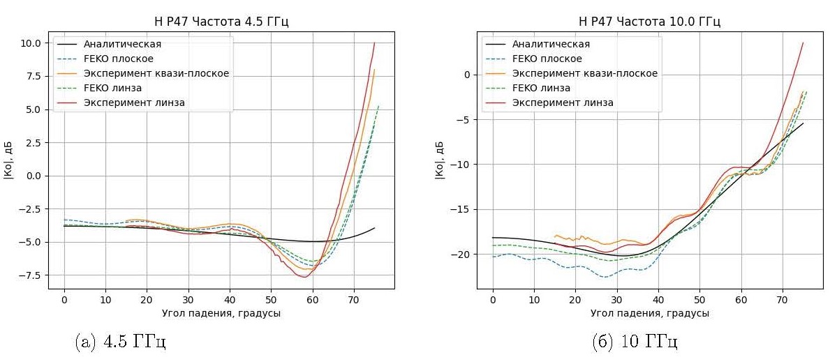 В настоящей работе разработанные и напечатанные линзы были интегрированы в стенд для измерений бистатических характеристик рассеяния. С помощью антенн с корректирующими линзами были получены угловые зависимости МКО для образцов материалов. Полученные результаты сравнивались с измерениями в квазиплоском поле, а также с результатами численного моделирования и аналитического расчета по формулам Френеля.