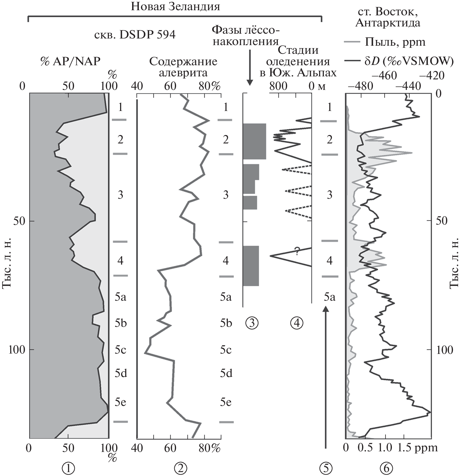 The main territories for the development of Late Pleistocene loess are located in the inland regions of the Northern Hemisphere, so the very existence of loess in New Zealand, a region with a temperate maritime climate, is of undoubted scientific interest. The analysis of geological, geomorphological, paleogeographical and geochronological data on the distribution, structure and formation conditions of loess in New Zealand in the Late Pleistocene has been carried out. The study showed that in New Zealand, as in other regions of the temperate latitudes of the Southern Hemisphere, the accumulation of loess occurred mainly in the cold phases of the last climatic macrocycle: in the Early Pleniglacial, 80 (75)–(60) 55 ka BP; (2) during cooling within MIS 3, 45–40 ka BP on the South Island and 40–30 ka BP, with a peak of about 30 ka BP, on the North Island; (3) in the Late Pleniglacial, from 25 to 17–12 cal ka BP. Comparison of these stages with the Antarctica ice cores data shows their close relationship with global climate change. The article reviews data on the current conditions for the development of eolian processes and the formation of loess-like deposits in New Zealand. In contemporary conditions, eolian processes in New Zealand are concentrated within geomorphologically active territories, e. g. in river valleys with glacier feeding and an abundance of loose sediments, in areas with widespread coastal sand dunes, and in those territories where vegetation and soil disturbances promote wind erosion of the surface layers of unconsolidated sediments. Large-scale anthropogenic impact (destruction of forests, disruption of the herbaceous cover due to intensive grazing of livestock, especially sheep, ploughing of slopes on light weakly cohesive soils, etc.) to some extent makes the present interglacial conditions for the development of eolian processes in New Zealand similar to periglacial ones.