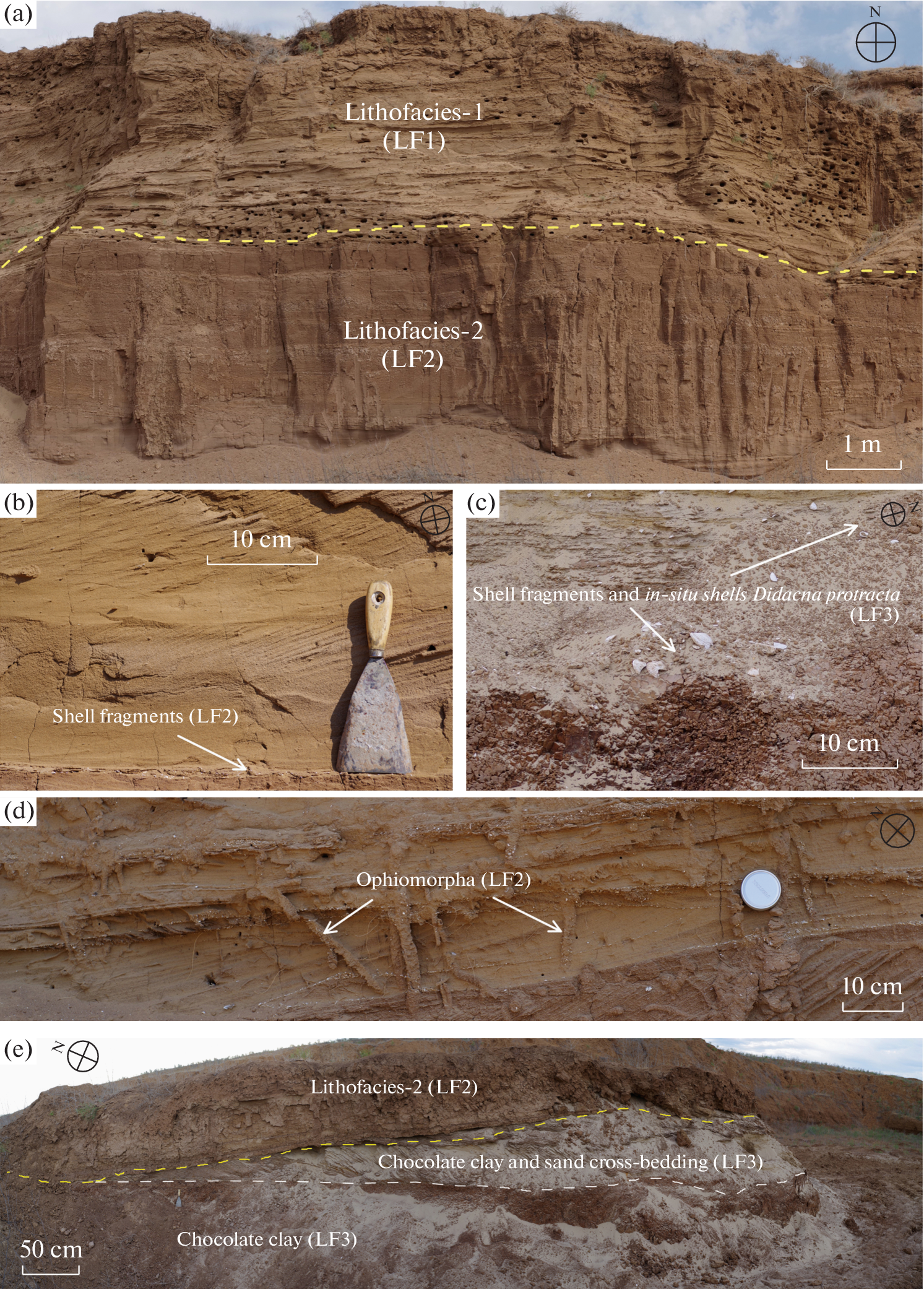 Baer knolls (BK) are elongated ridges often close to the sub-latitudinal orientation sometimes spatially isometric that are widespread in the entire Northern Caspian Region up to 0 m a.s.l. (the upper limit of the Late Khvalynian sea transgression). The goal of this study was to establish the genesis of BK based on interpretation of textural and lithologic characteristics of sediments and dating the material composing these landforms. Research has led to the following conclusions that BK have been formed during the transition of Late Khvalynian and Early Holocene time. Sediments of BK consists of three lithofacies (LF1, LF2, LF3). Chocolate clay (CC) and Volga alluvium were significant sources of material for knolls formation. Nonetheless, for lithofacies 1, it was also sandy material lying below the CC. The BK material cannot be attributed to the aeolian genesis because of its lithological, faunal and geochemical characteristics. The knolls formed in brackish subaquatic conditions of the lagoon floor, where a low-energy currents occurred due to the descent of Late Khvalynian basin waters through the Manych Strait. Thus, BK are analogues of river bedforms appearing as the result of turbulent flow, like ripples and river dunes, where, in concordance with the accumulation of sandy material and detritus of redeposited shells, clay particles were deposited under the mixing of the brackish water of the lagoon and the fresh water of the rivers flowing into it.