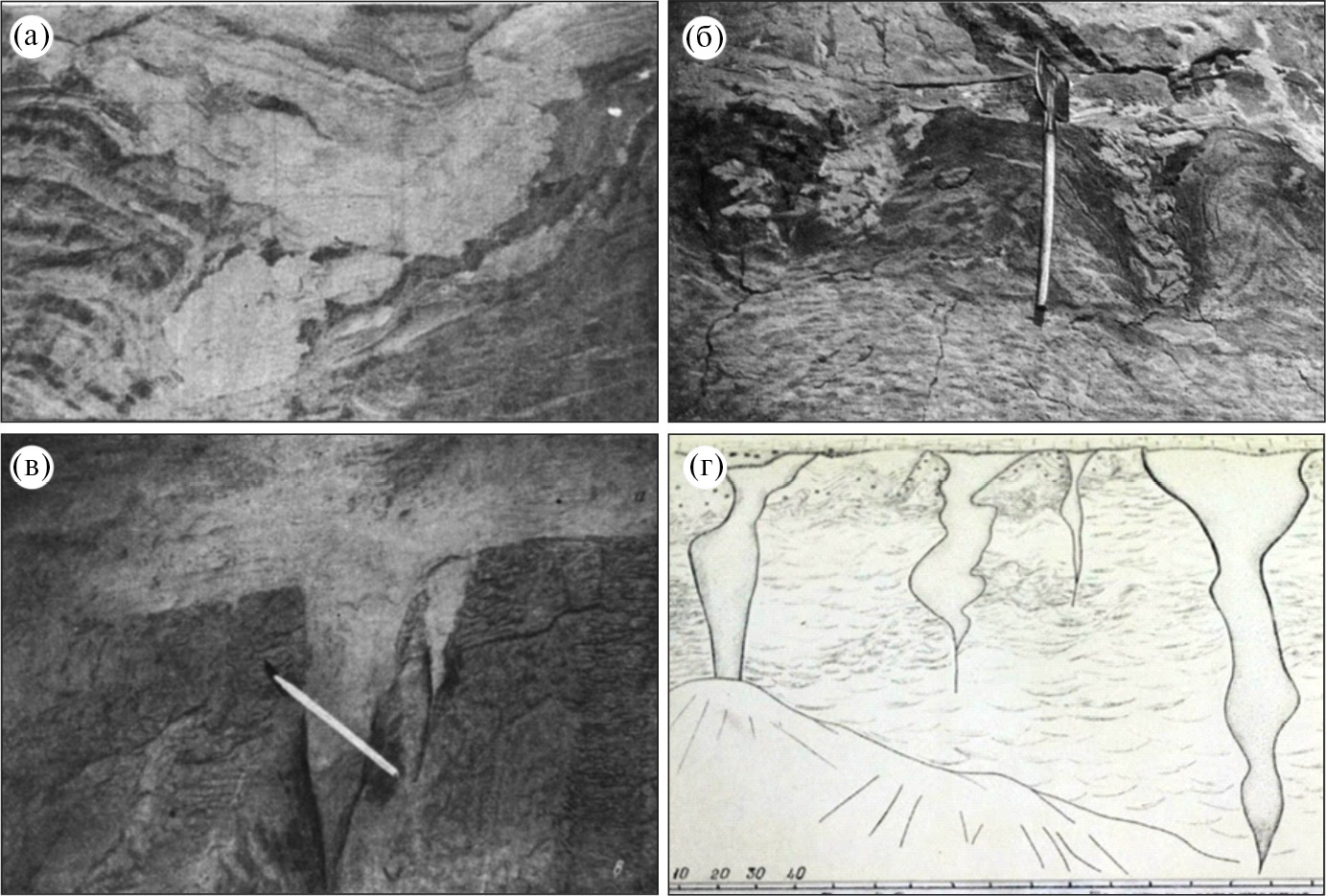 Fig. 1. Cryogenic structures of the Lower Volga region (according to literary sources): (a) – permafrost “pot” in the section near the Kopanovka (Vasiliev, 1961); (б) – pseudomorphs of ice wedges near Volzhsky city, filling with Akhtuba sands (Moskvitin, 1962); (в) – ice wedges transformed into “pots” at the contact of Akhtuba sands and Khazar silts, Nizhneye Zaymishche (Moskvitin, 1962); (г) – cracks in the section near Chernyy Yar (Shkatova, 1975)