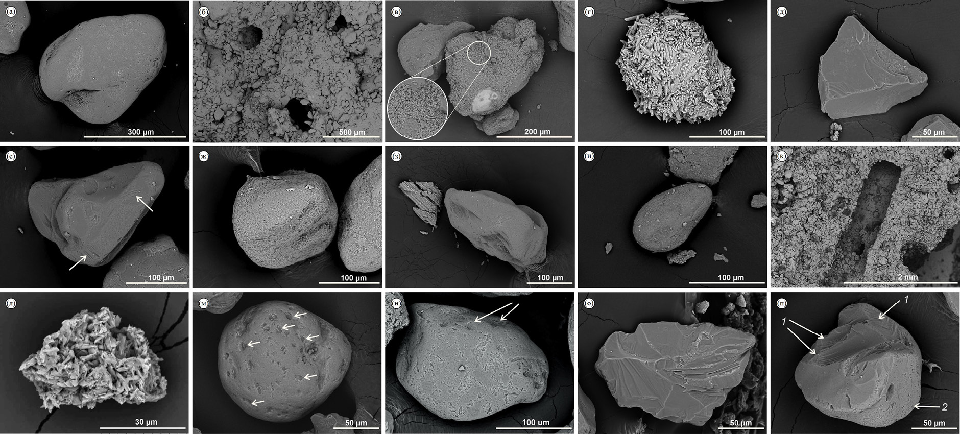 Fig. 5. Microstructure and morphology of quartz grains in the deposits of the Lower Volga region: (a) – crescent-shaped grooves on the surface of quartz particles (SA-2); (б) – pores with dense walls (RG-2); (в) – calcite coat on the grain surface (RG-2); (г–з) – grain morphology of the Chernyy Yar section (CY-1): (г) – aggregate composed of calcite (inclosing sediments, layer 7); (д) – angular grain with conchoidal chips; (е) – angular grain with smoothed angles and parallel grooves (white arrows); (ж) – isometric grain with a surface covered with small pits; (з) – elongated grain with smoothed angles, pits on the surface; (и) – rounded grain from the material of pseudomorphosis (KOS-4); (к) – tubular pore in loess microstructure, Srednyaya Akhtuba section; (л) – calcite (CaCO3), Srednyaya Akhtuba section; (м) – isometric grain with unevenly distributed pits on the surface (white arrows) (filler of the tail part of ice wedge cast, LN-2); (н) – depressions and pits on the surface of the grain (horizon LN-2); (о) – angular grain with numerous chips on the surface (LN-2); (п) – grain with fresh conchoidal fractures (1) and a surface that has retained its original roundness (2) (LN-2)