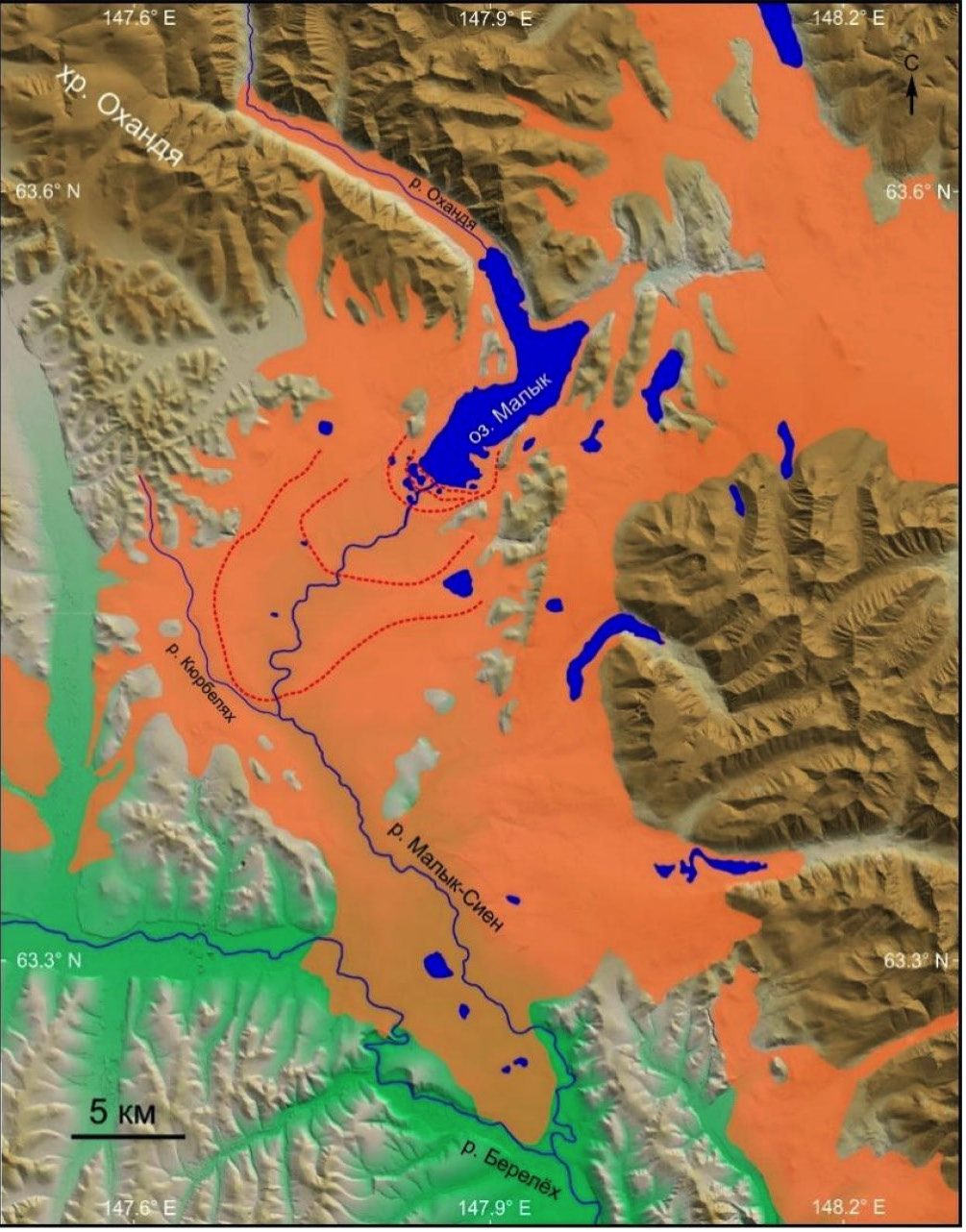 Анализ распространения конечно-моренных гряд в долине р. Малык-Сиен выполнялся посредством дешифрирования космических снимков различного разрешения (Google Earth Pro, https://www.google.com/intl/ru_ALL/earth/versions), изучения цифровой модели рельефа ArcticDEM (Morin et al., 2016; https://www.pgc.umn.edu/data/arcticdem/) и составления карт-схем различного масштаба.