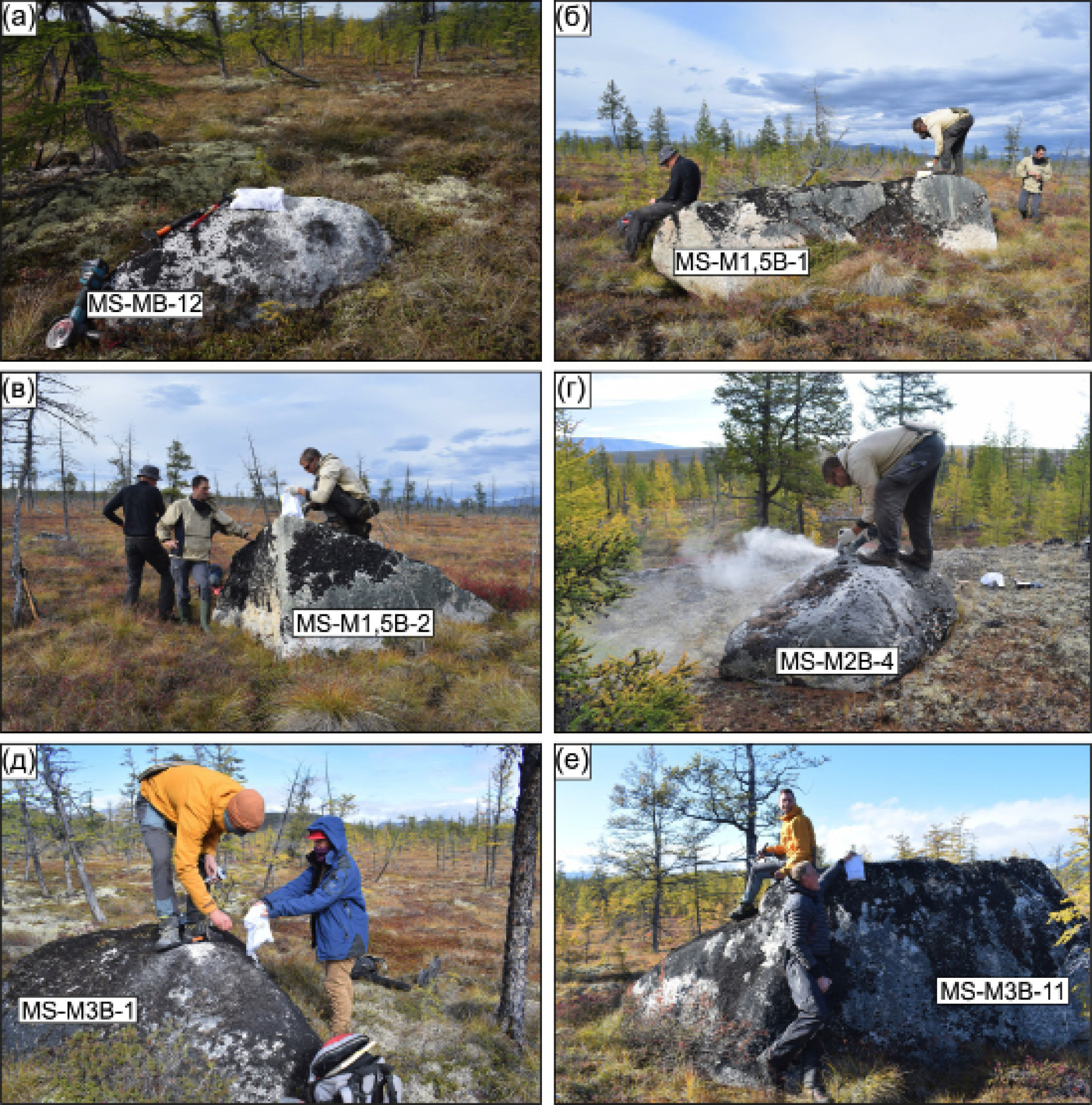 Рис. 3. Выборка сравнительно высоко выступающих валунов и их опробование для датирования времени экспозиции (табл. 1). Валуны, расположенные на моренах: (а), (б), (в) – на внешней, (г) – на средней, (д), (е) – на внутренней
