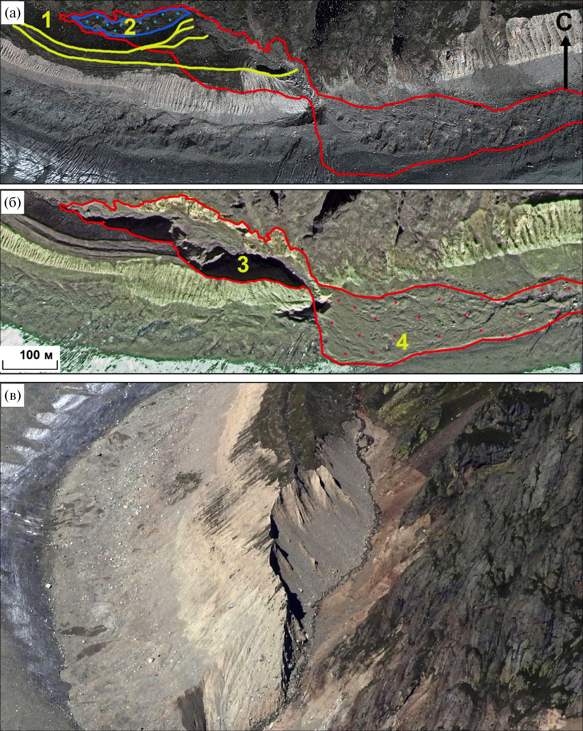 Fig. 8. A section of the lateral moraine of the Mizhirgi glacier: (a) – Google Earth satellite image 28.10.2019 Pleiades-1A, (б) – photo from the quadcopter 26.07.2022, (в) – photo from the quadcopter 28.08.2022. The red line is the ridge of the lateral moraine of the XXI century, the yellow line is the ridge of the lateral moraine of the little Ice Age, the blue line is the watercourse bed in the pocket of the lateral moraine, the red arrows indicate the location of the fracture of the displacement of the ridge of the lateral moraine