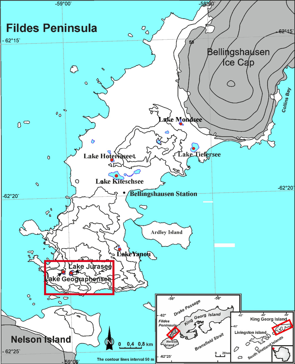 Lake Geographensee with an area of about 0.01 km2 (62°13ʹ00.0ʺ S, 59°01ʹ00.0ʺ W, 40 m a.s.l.) is located next to Lake Jurasee (47 m a.s.l.) in the flat, wide and short valley that crosses the southern tip of the peninsula from northwest to southeast (fig. 2). The elevation of the valley floor ranges from 40 m to 50 m a.s.l., being over all higher around Lake Jurasee than around Lake Geographensee. The valley floor between Lakes Geographensee and Jurasee is flat and elevated by 2–3 m above 50 m a.s.l. Along the northern and southern boundaries of this section of the valley there are short dry stream beds that may have previously connected the lakes if the water level in Lake Jurasee rose to a height of 50 m a.s.l. Lake Geographensee catchment of about 0.2 km2 includes the valley floor and gently descending slopes, that stretch to the northeast and southwest from the lake at the heights of about 65 m a.s.l. into steep slopes of bedrock outcrops. Northwest of the lake the valley bottom descends to the seashore, at first relatively steeply, and then becomes gentle in the coastal part. Currently, the lake’s water outflows from its northwestern part during periods of maximum melting in the summer along the bottom of a narrow channel cut into the valley floor. Judging by the depth of this channel, the lake level in the past could have been several meters higher. The floor of the valley and the lake’s catchment slopes are covered mainly with fine-grained sediments (silt, loam) with mixture of gravel and rubble. Rare vegetation in the catchment area is represented by patches of mosses mostly concentrated in small moist relief irregularities and in the temporary stream beds through which the melted waters from small snowfields flow.