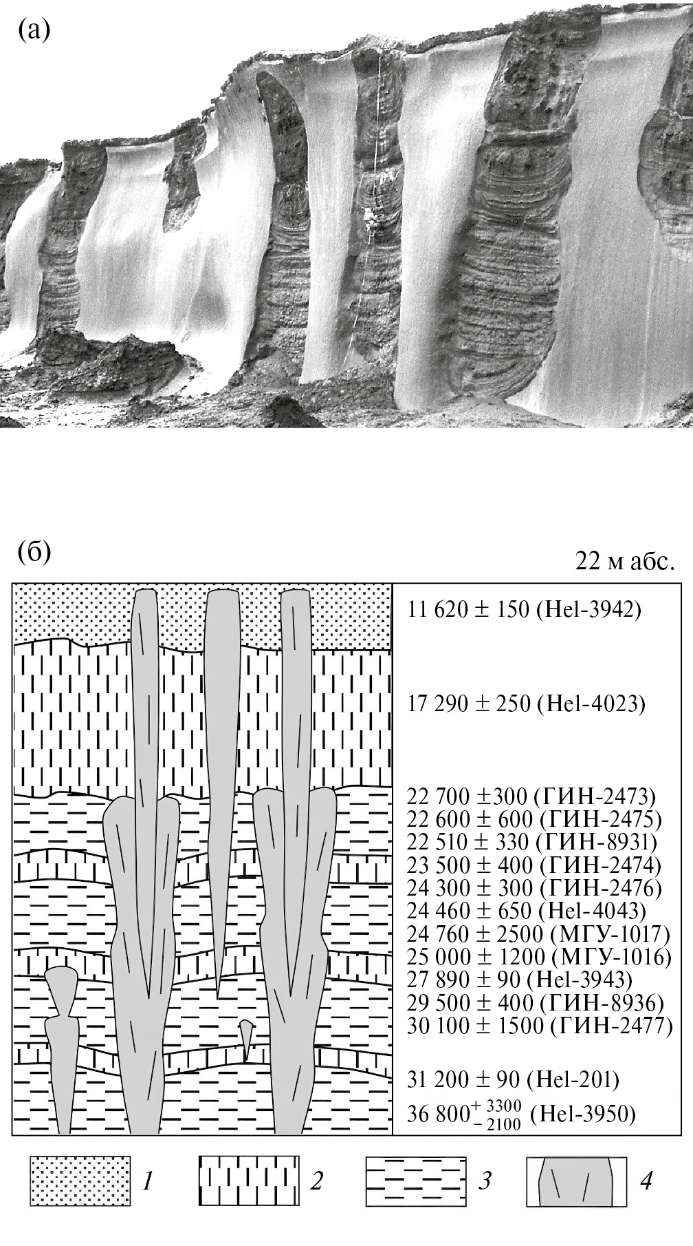 Рис. 2. Криогенно-эоловые отложения Арктики. (а) — типичная едомная полосчатая толща лёссовидных алевритов с лентами сегрегационного льда и моховыми начесами, проткнутая сингенетическими ледяными жилами в разрезе на о-ве Бол. Ляховский, 73.5° с. ш. (фото В.Е. Тумского). (б) — датированный разрез в устье р. Се-Яха, 70° с. ш. (С на рис. 1), по (Vasilchuk, Vasilchuk, 1998) с упрощениями. 1 — мелкий песок, 2 — крупный алеврит, 3 — алеврит с торфянистыми прослойками, 4 — сингенетический жильный лед. ¹⁴C-даты не калиброваны.
