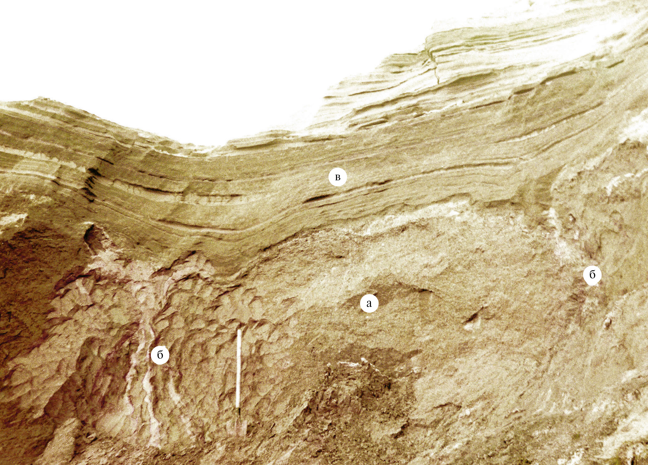 В подошве несогласно залегающей пачки В наблюдается каменистый диамиктон солифлюкционного облика с сильно выветрелыми валунами. Основная часть пачки сложена тонкослоистым песком, видимо, отложенным в небольшом озерке. В песок внедряются тонкие (5—10 см) языки, а вдоль кровли и 1-метровый слой, очевидно, сползший в озерко и состоящий из неправильных линз солифлюкционного диамиктона, песка и глины с штрихованными валунами и растительным детритом, со следами течения по склону. Мамонтовый бивень хорошей сохранности на пляже с практически запредельной ¹⁴C-датой 48 тыс. л., видимо, был вымыт из этого слоя. Пачка Г, прослеженная на несколько километров вдоль берега, состоит из зеленовато-серого мелкого песка мощностью 5—10 м. Он имеет слабую горизонтальную слоистость и очень похож на покровный песок в разрезе Мархида (М на рис. 1). В него от кровли внедряются узкие песчаные клинья, вероятно, псевдоморфозы по повторно-жильным льдам.
