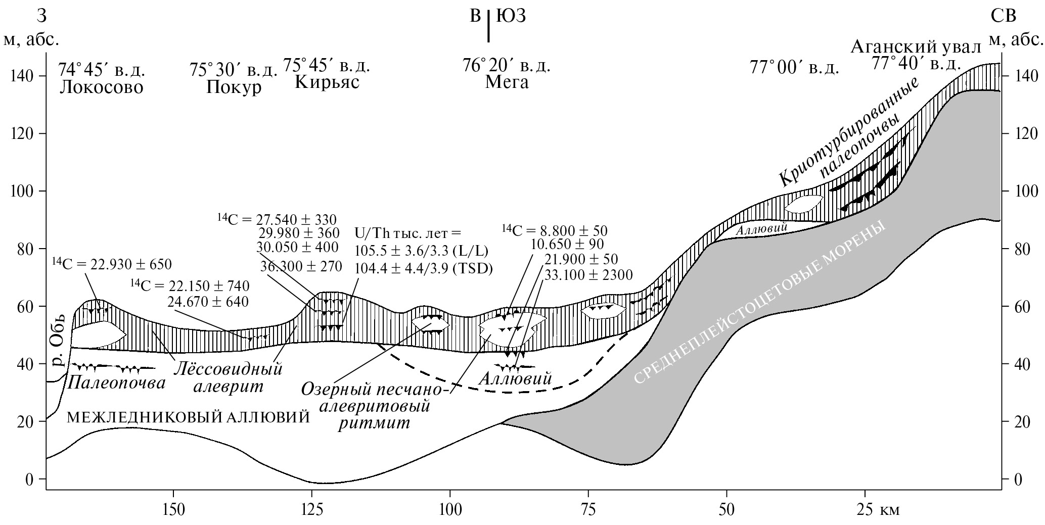 Рис. 15. Перигляциальные образования Широтной Оби по профилю Локосово–Мега–Аган (Астахов, 1989) (61° с. ш.; Л-М-Аг на рис. 1). ¹⁴C-даты не калиброваны.