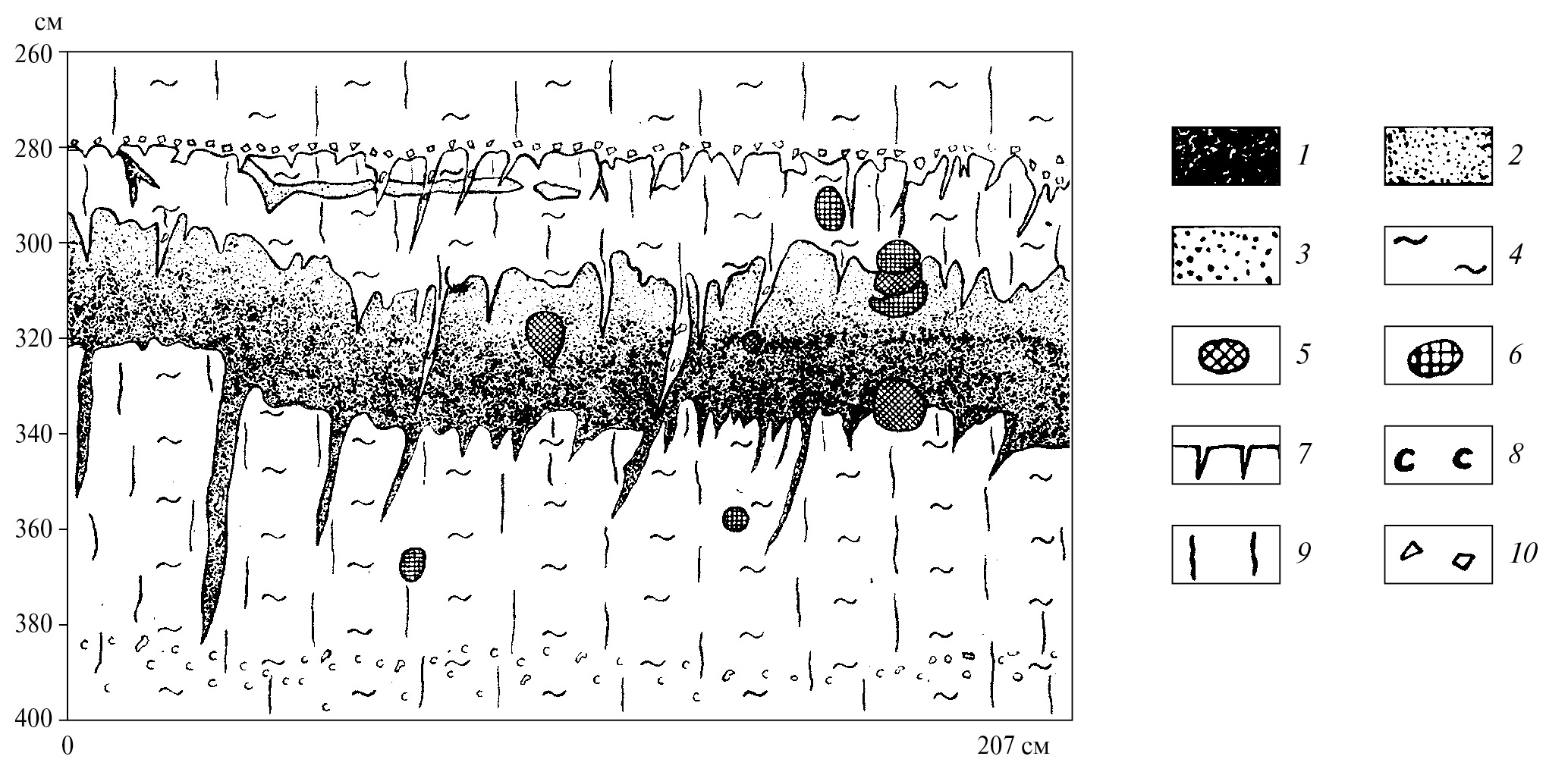 Fig. 10. Structure of the lower soil of the Iskitim pedocomplex (MIS 3) in the Lozhok quarry. For the symbols, see fig. 8.