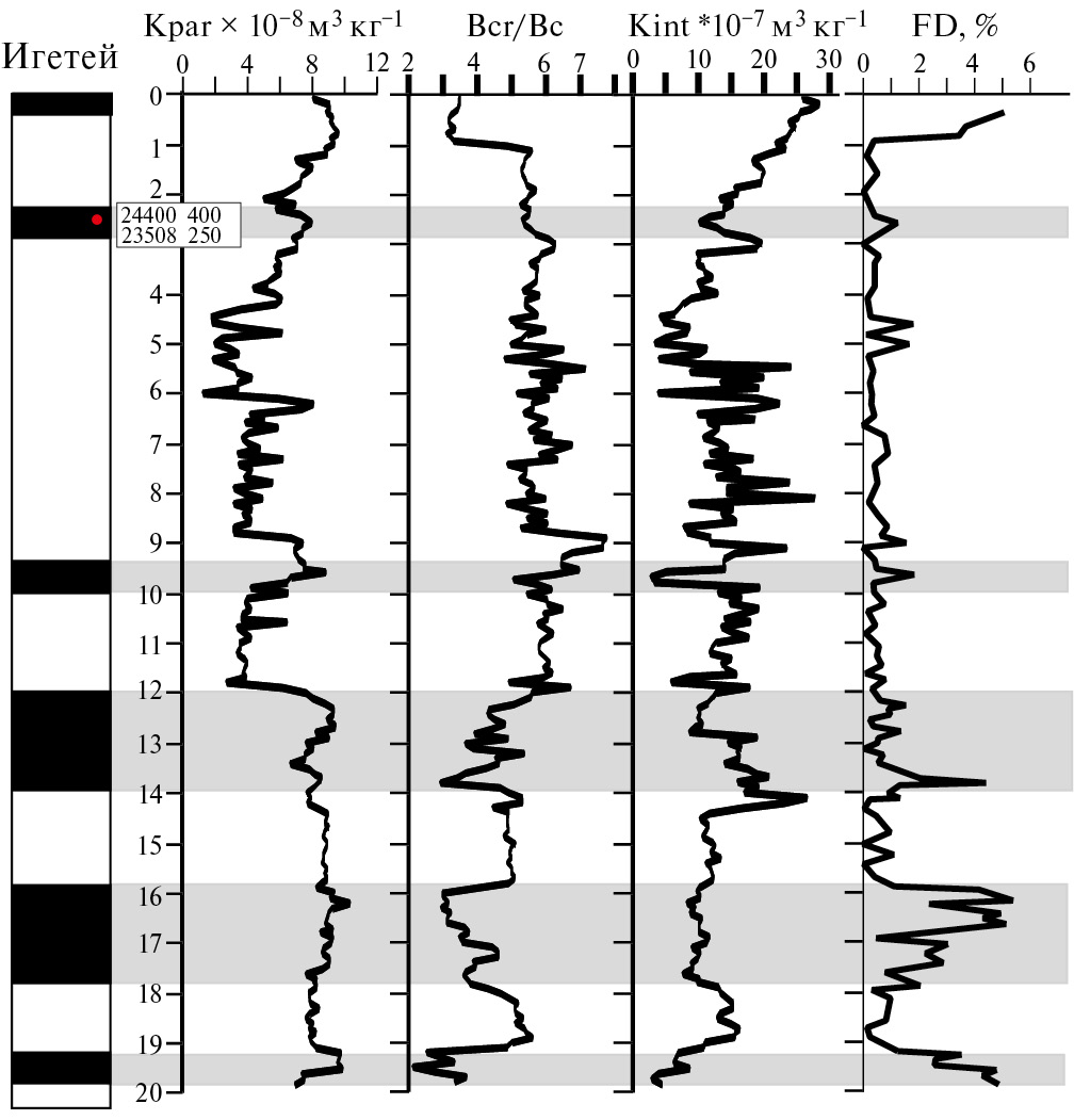 Рис. 3. Магнитные параметры средне-верхненеоплейстоценовых отложений разреза Игетей. Усл. обозначения см. рис. 2.