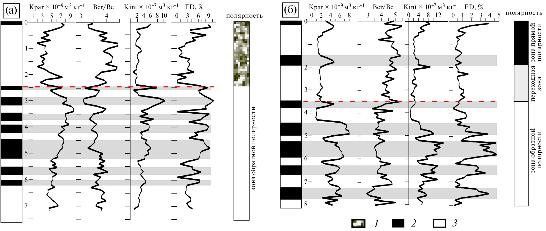 Основные магнитные характеристики (МВ и FD) палеопочв и вмещающих отложений для обоих механизмов отражены в табл. 1.