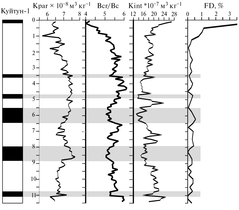 Поведение магнитной восприимчивости (Kint) и FD-фактора по разрезу (рис. 2) позволяет квалифицировать магнитную запись в разрезе Буреть по типу слабого “сибирского” механизма (МВ палеопочв в ~2 раза меньше, чем МВ вмещающих отложений; FD в почвах достигает 3.5—4 %, во вмещающих отложениях <1.5 %). Два других параметра являются универсальными и демонстрируют различия в палеопочвах и вмещающих толщах: парамагнитная восприимчивость (Kpar) увеличивается в почвенных горизонтах и достигает 65—85 % от общей магнитной восприимчивости, тогда, как во вмещающих отложениях снижается и варьирует между 30 и 50 %; эффективный размер магнитного зерна (Bcr/Bc) уменьшается в палеопочвах и увеличивается в остальных осадках, причем наиболее четкая картина прослеживается в нижних, более развитых почвенных горизонтах.