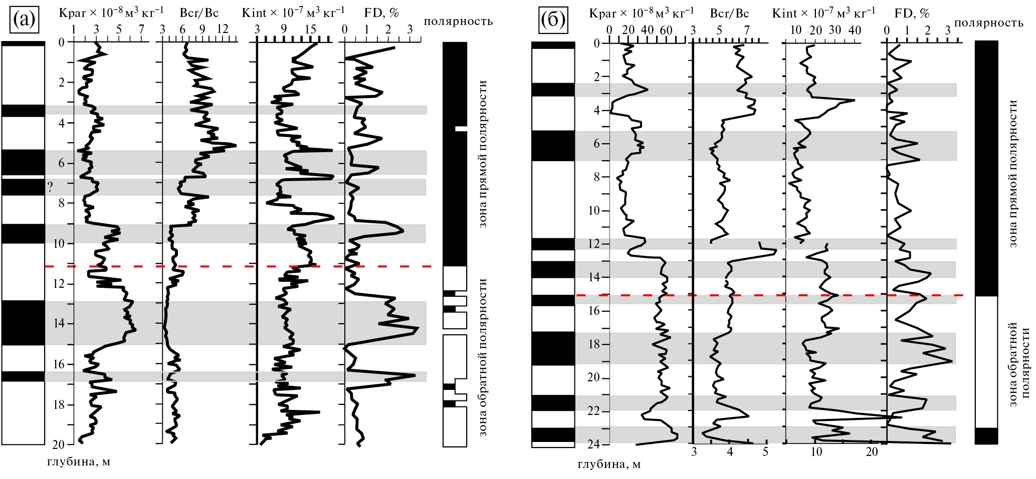 В верхней части разреза нивейные пески и палеопочва высокомагнитны и демонстрируют самые высокие значения МВ в Предбайкалье; разница в 2.0—2.5 раза между МВ верхней почвы и песков сохраняется (рис. 2). Значения FD-фактора здесь не превышают 1 % (за исключением современной почвы). Такое поведение двух видов МВ характерно для “аляскинского” механизма магнитной записи. В отложениях нижней части разреза МВ резко падает, хотя сохраняется тенденция более низких значений магнитной восприимчивости в палеопочвенных горизонтах, чем во вмещающих осадках. Значения FD-фактора, наоборот, в почвах возрастают до 4.5 %, а во вмещающих отложениях остаются <1 %, что позволяет квалифицировать магнитную запись по типу среднего “сибирского” механизма. Парамагнитная компонента (Kpar) во всех палеопочвах показывает повышенные значения по сравнению с вмещающими отложениями, независимо от смены механизма. Эффективный размер магнитного зерна (Bcr/Bc) также уменьшается в палеопочвах и увеличивается в остальных осадках, наиболее четкая картина прослеживается в нижних, более развитых почвенных горизонтах.