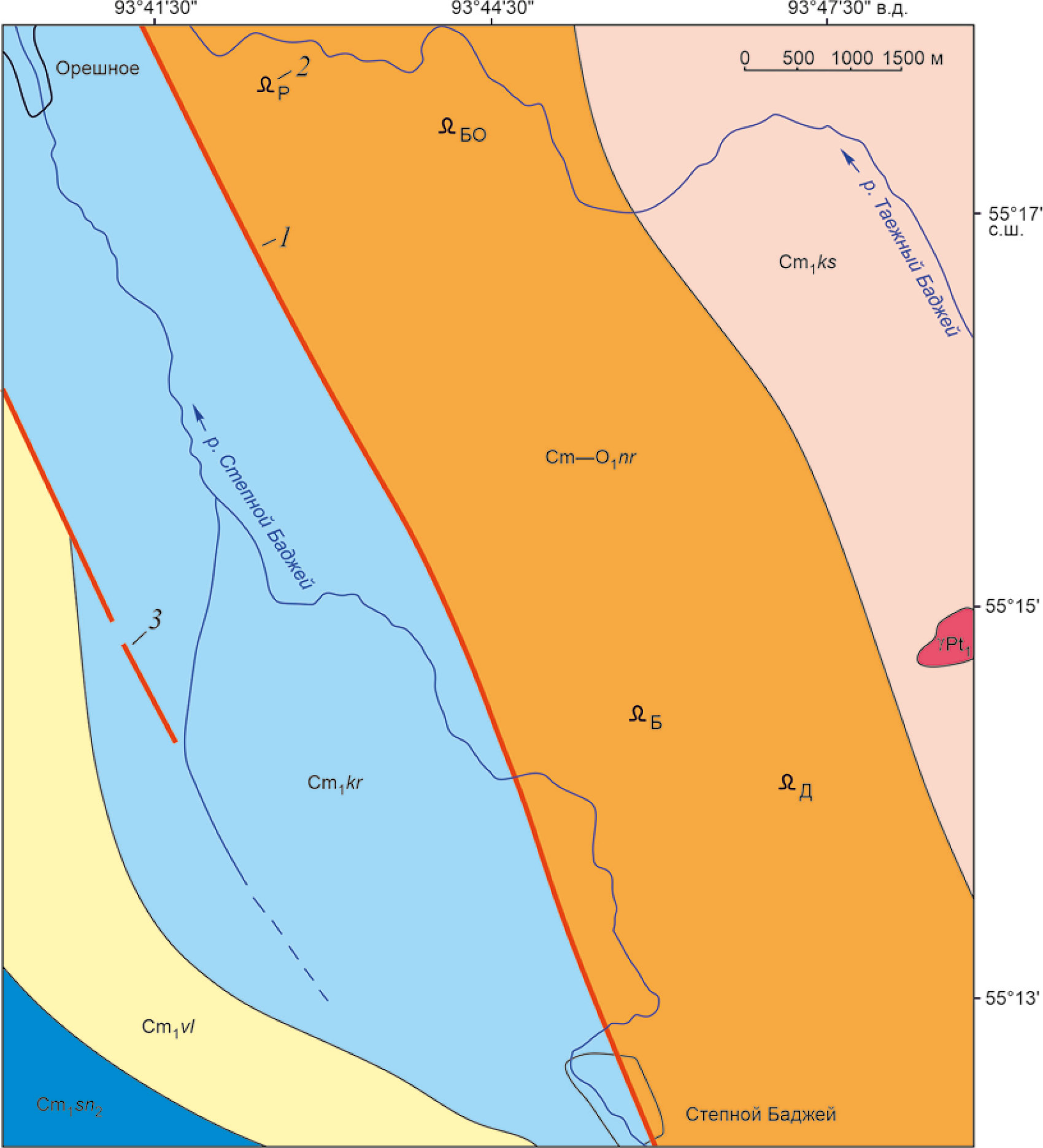 Рис. 1. Геолого-тектоническая схема Баджейского участка. Cm₁sn₂ — синерская подсвита, массивные доломиты; Cm₁vl — свита Выезжего лога, глинистые сланцы; Cm₁kr — крольская свита, доломиты; Cm₃-O₁nr— нарвская конгломератовая толща, известковисто-глинистые конгломераты, валуны-доломиты, галька-кварцевый кремень; Cm₁ks — койская свита, кварцевые песчаники; νPt₁ — микроклиновые гранито-гнейсы; 1 — разломы; 2 — пещеры (Р – Ручейная, БО — Большая Орешная, Б — Баджейская, Д — Дудинская); 3 — предполагаемые разломы.