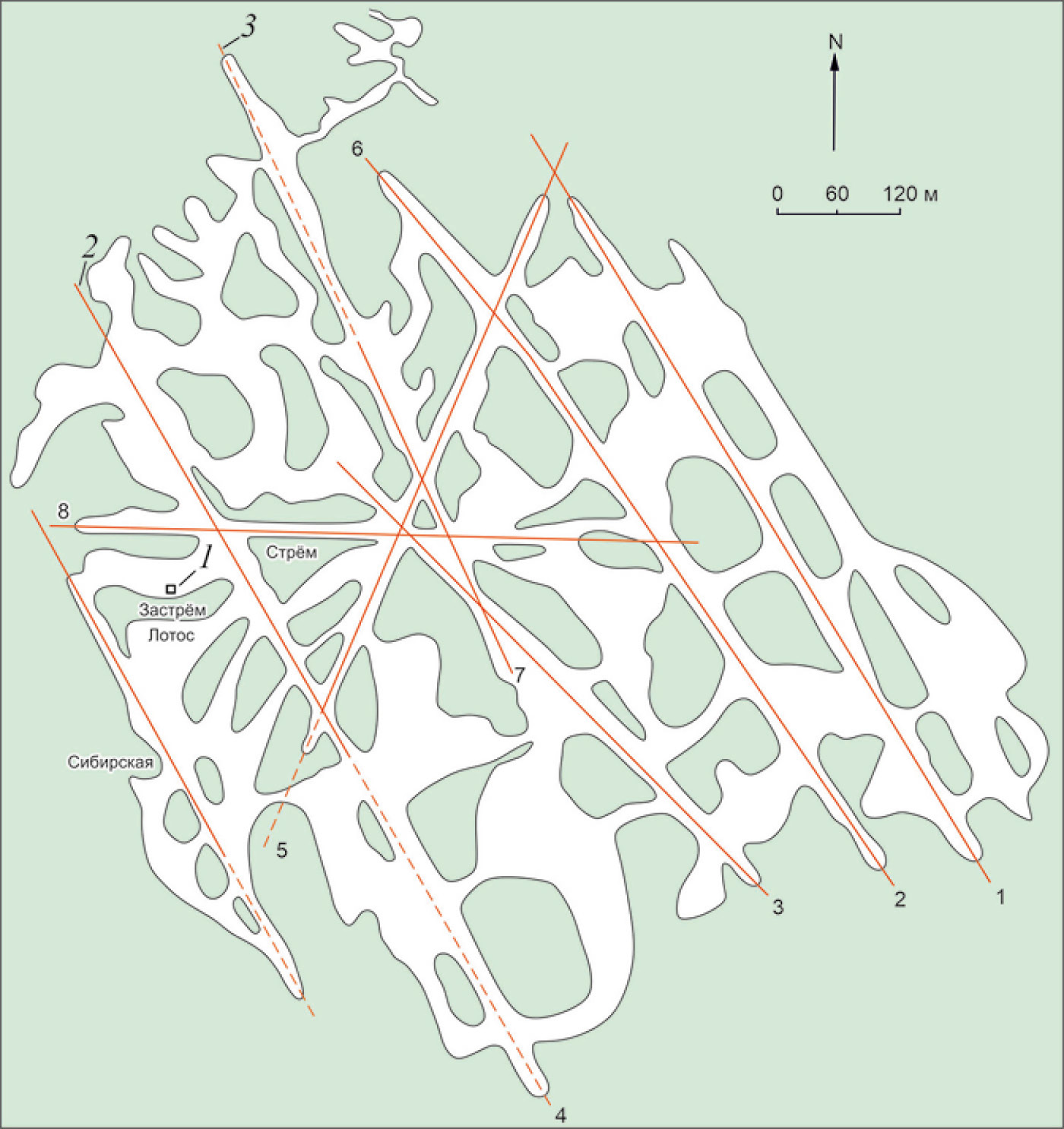 Системы Сибирская, Лотос и “Стрем” отделены от основной части пещеры разломом Вертикаль (Bulychov, Sorokina, 2017) шириной до 20 м, который приводит к предвершинному плато, где заложена близлежащая к поверхности часть пещеры Большая Орешная. В результате обработки геофизических измерений предположены пустоты на глубинах 3—8 м, поэтому был преодолен глыбовый завал в системе “Стрем” снизу вверх и открыта система “Застрем”, которая оказалась очень близко к дневной поверхности (3—5 м), но полностью перекрыта валунами, сцементированными карбонатно-алевритовым матриксом.