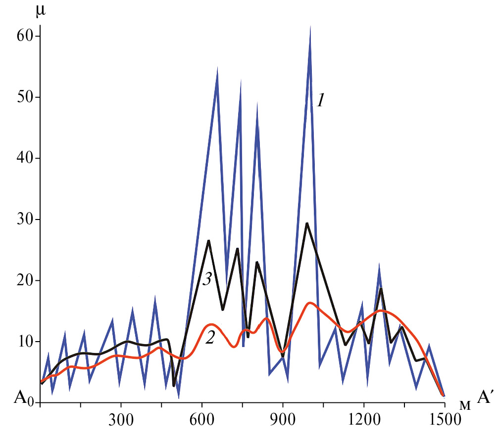 Fig. 5. Averaging of primary data along the А–Аʹ profile at the Dudinskaya Cave site. 1 — original function; 2 — polynomial; 3 — averaging.