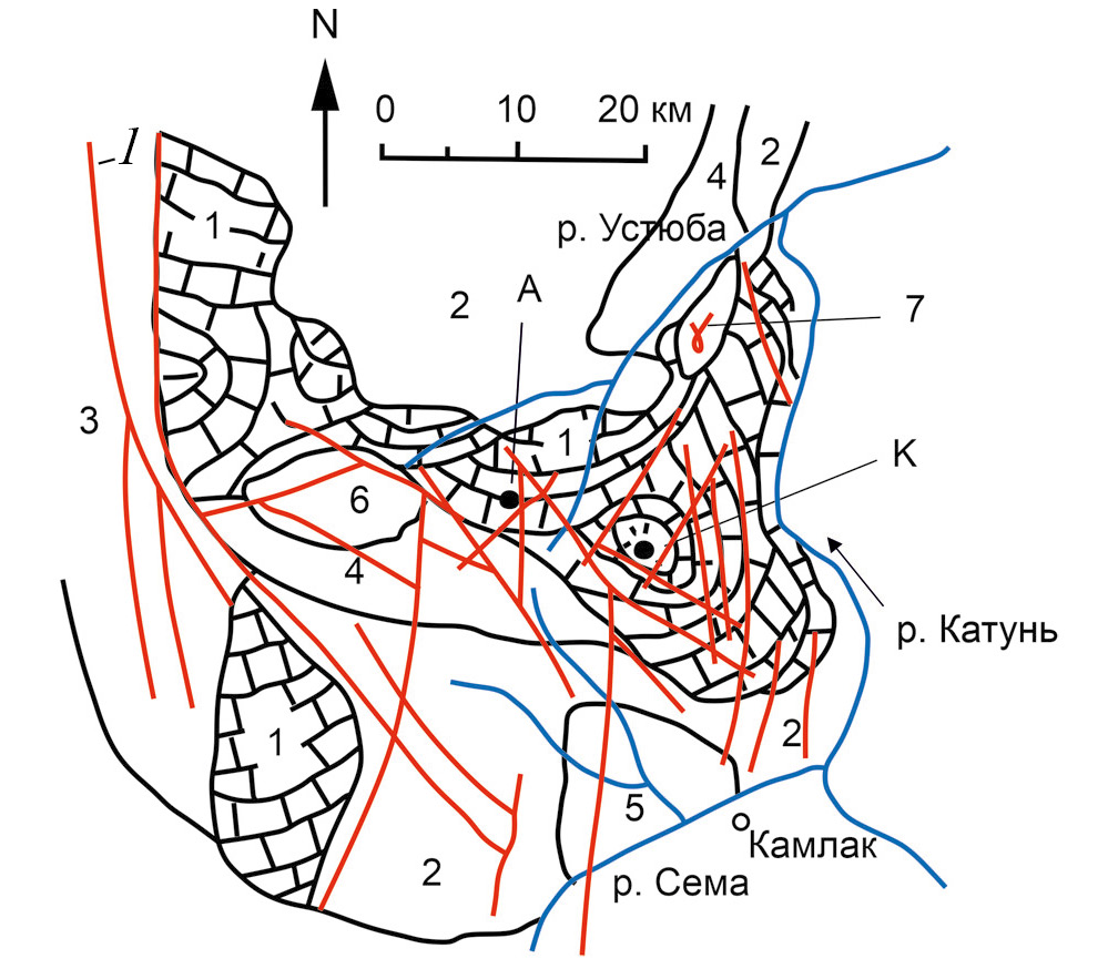 Fig. 8. Geological-tectonic scheme of the region of Altaiskaya and Kek-Tash caves. 1 — marbled limestones Cm1kn; 2 — effusives Cm2km; 3 — effusives D2kr; 4 — marbles Snbr; 5 — terrigenous-volcanogenic rocks Sn-Cm1mn; 6 — lava breccia with cantomenate Cm12; 7 — granitoid; caves: А — Altaiskaya cave, К — Kek-Tash cave; 1 — faults.