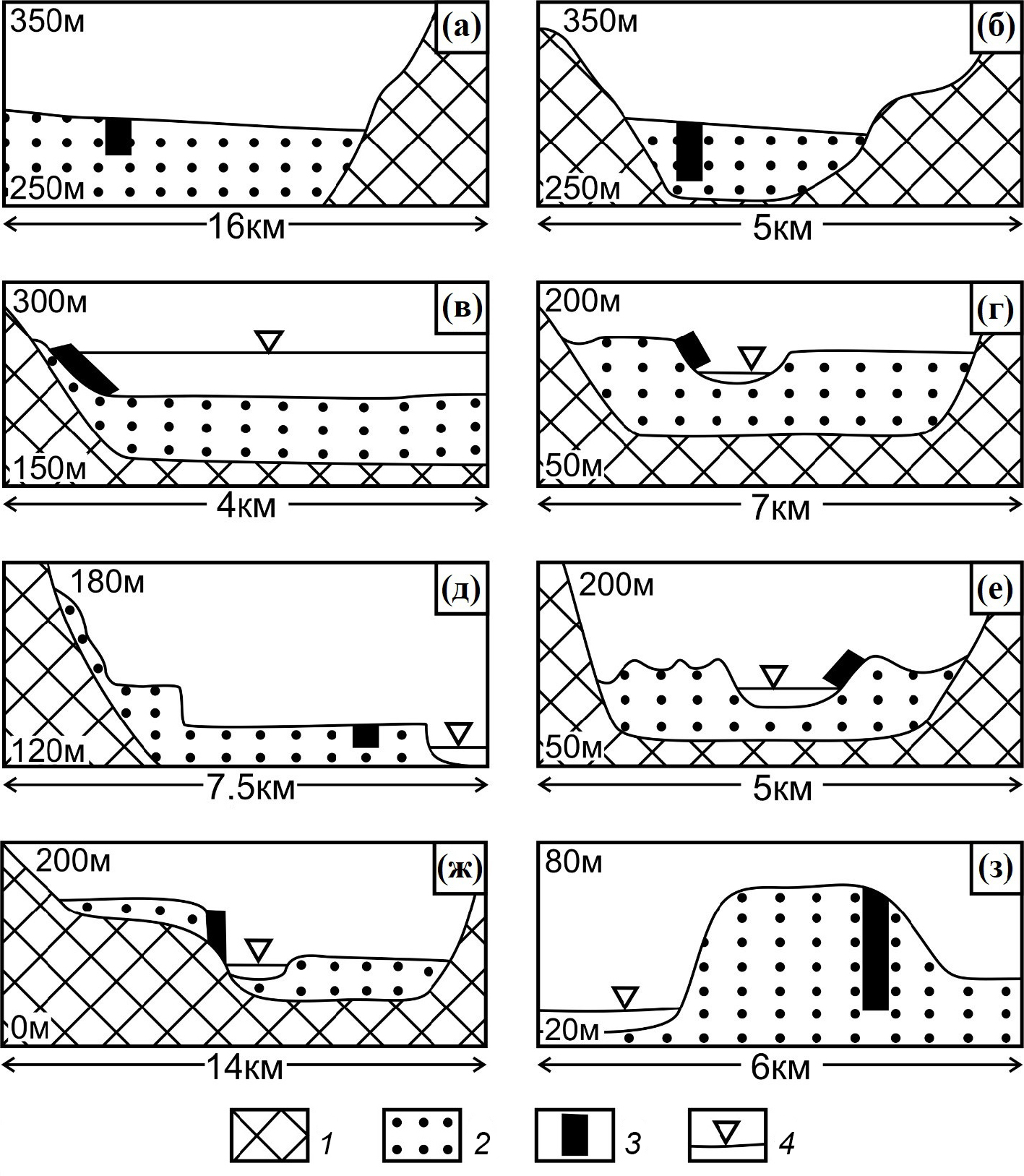 В опесчаненый субаэральный тип выделены палевые лёссы и делювий, наблюдаемые в верхних частях всех разрезов, приведенных на рис. 4. В следующий генерализованый литотип объединены хорошо сортированные пески, алевропески, алевриты, обладающие в разной степени выраженной параллельной слоистостью. Для них характерны частые фациальные замещения друг на друга. В изученных разрезах парагенезис флювиальных отложений слагает три разновозрастных толщи, располагающихся друг над другом и разделенные субаэральными толщами. Особенно четко это фиксируется в Бережековском разрезе (см. рис. 4, (а)). Подчеркнем, что смена коричневых алевритовых типичных лёссов и делювия на опесчаненые генетические аналоги происходит над кровлей нижней из трех флювиальных пачек. Предшествовавшими исследователями эти флювиальные отложения трактовались как “аллювий высоких террас”, “перигляциальный аллювий”, “ложковый аллювий” (Дроздов и др., 2005). Однако на разрезах видно, что подошвы флювиальных толщ залегают не субгоризонтально и не в виде русловых врезов, а облекающе, что не типично для аллювия. Более того, на рис. 4, (б и г) изображены разрезы, в которых отчетливо фиксируется тот факт, что верхняя флювиальная толща воздымается от нижней части разреза почти до самой бровки обрывов (до подошвы маломощного верхнего субаэрального покрова). При этом наблюдается несколько типов контактов с подстилающими отложениями.