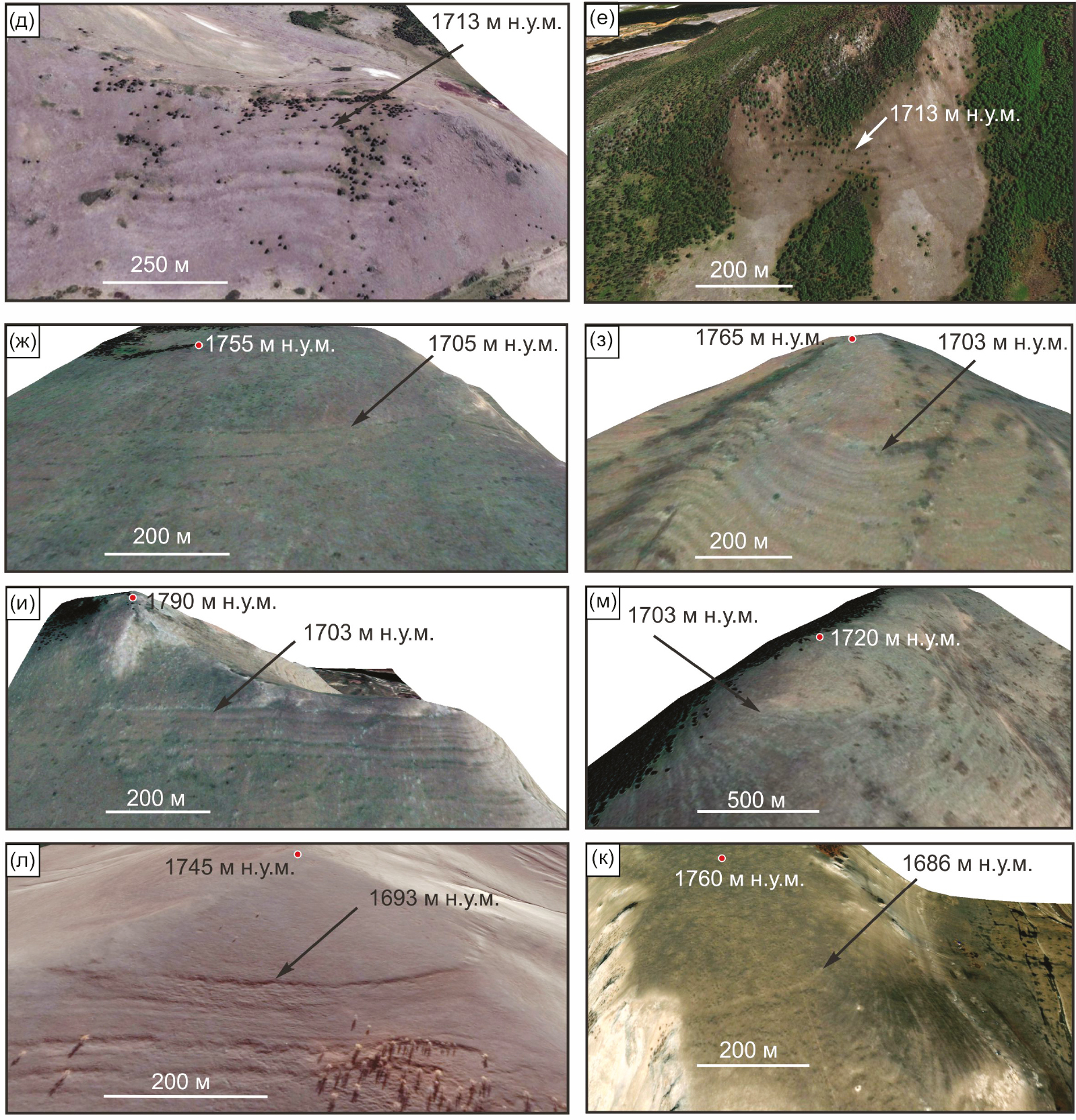 Анализ космоснимков и радарных данных показал, что максимально высокая береговая линия палеоозера, не постоянна по высоте и изменяется от 1713 м над у. м. до 1686 м над у. м. (рис. 5, 6). Например, на южных склонах небольшого хребта, расположенного к северу от озер Доод-Нур и Тарган-Нур, максимально высокие береговые озерные линии прослеживаются на высоте около 1705–1703 м над у. м. (рис. 5, 6 (ж–к)). К юго-западу верхняя береговая линия имеет абс. высоту 1693 м, а еще южнее 1686 м (рис. 5, 6 (л, м)).