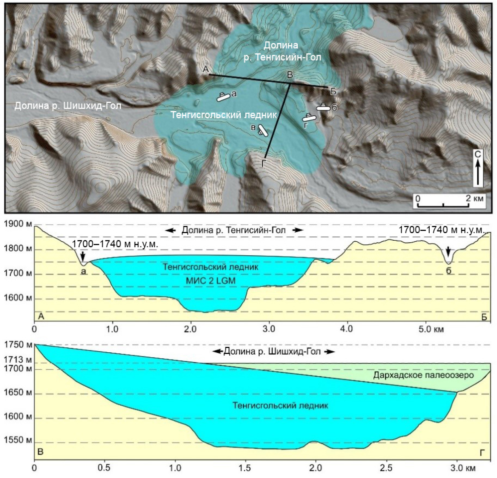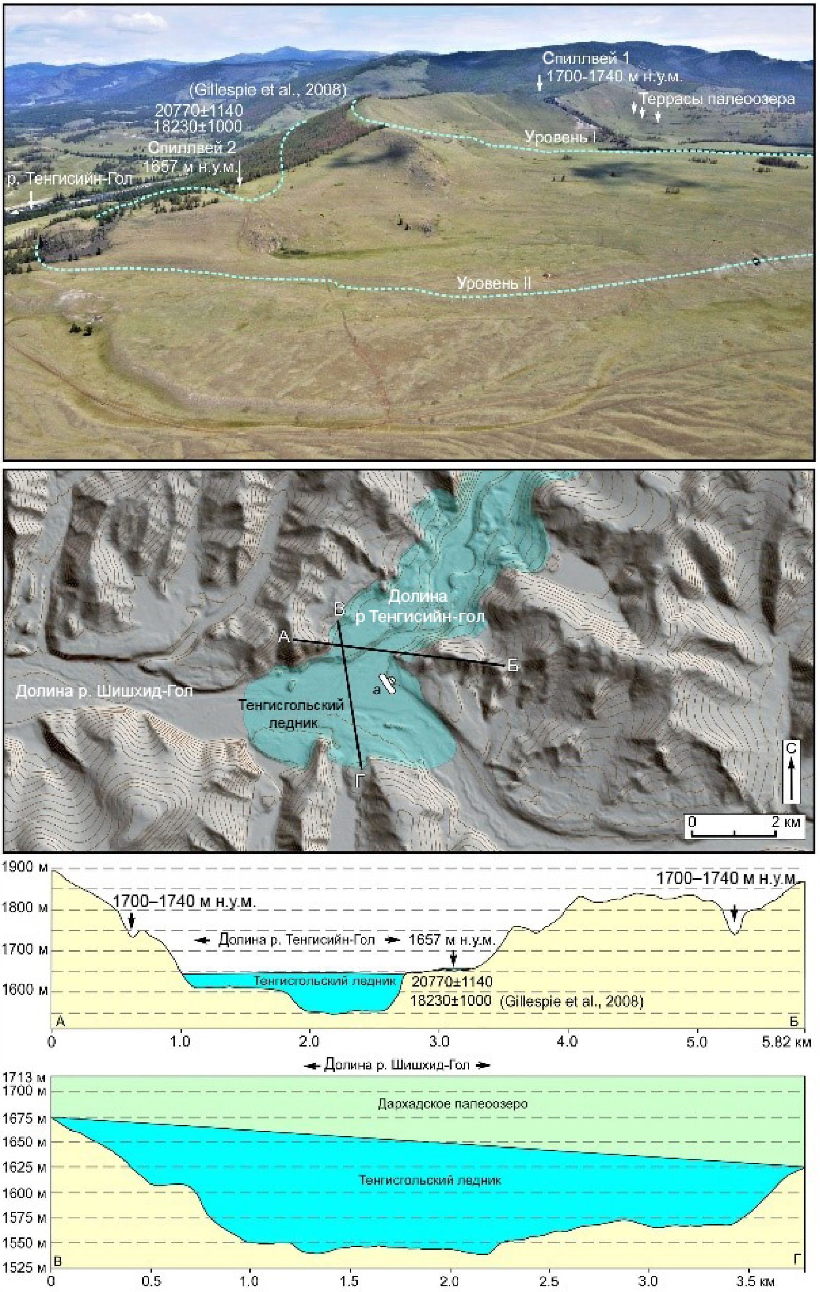 Уровень II реконструируется по нижнему спиллвею (1657 м над у. м.) в левой устьевой части р. Тенгисийн-Гол (рис. 10). Для канала стока имеется ¹⁰Be-дата экспонирования (рис. 10), попадающая в МИС 2 (Gillespie et al., 2008). На профилях АБ, ВГ (рис. 10) показана реконструкция ледникового уровня II свидетельствующая о его значительном снижении в устье р. Тенгисийн-Гол. Исходя из параметров двух уровней Тенгисийнгольского ледника, в пределах долины р. Шишхид-Гол (рис. 8, 9, 10) и распространения озерных террас ниже устья р. Тенгисийн-Гол (рис. 8), мы можем утверждать, что если Тэнгисингольский ледник и выполнял подпорную функцию на определенных этапах своего развития, то его уровень был гораздо ниже, чем максимальный уровень воды в Дархадском палеоозере.