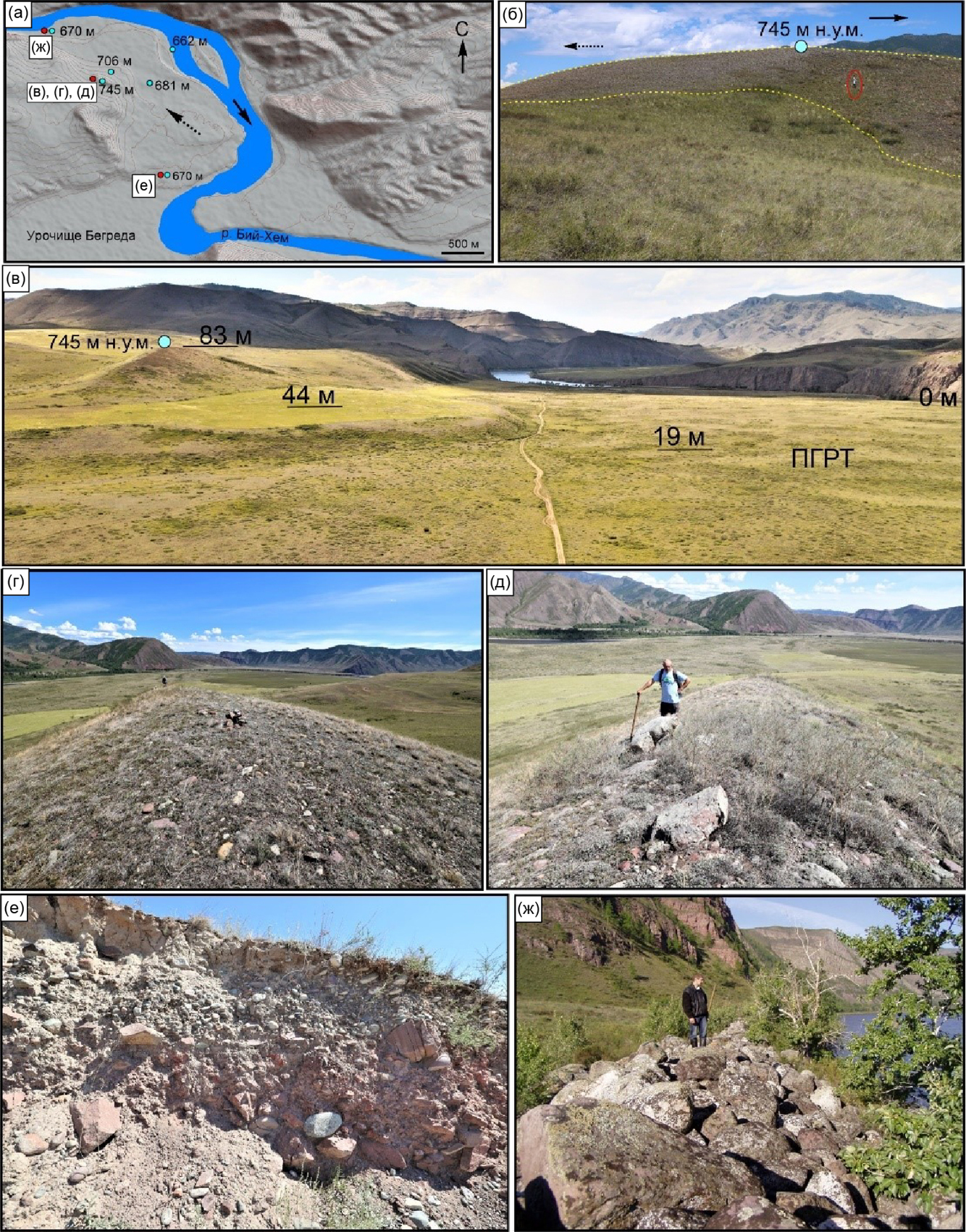 ПГРТ № 3 (51°40.020´N; 94°53.032´E) (рис. 3, (в)). Точки отбора образцов расположены к северо-западу в 0.3–0.7 км от пос. Суг-Бажи. Поле отбора образцов представляет собой систему валов высотой 0.5–0.7 м, расположенную на высоте 14 м над современным уровнем воды в р. Каа-Хем. С этого уровня были взяты 5 образцов (Tuva-16-17, 18, 19, 20, 21).