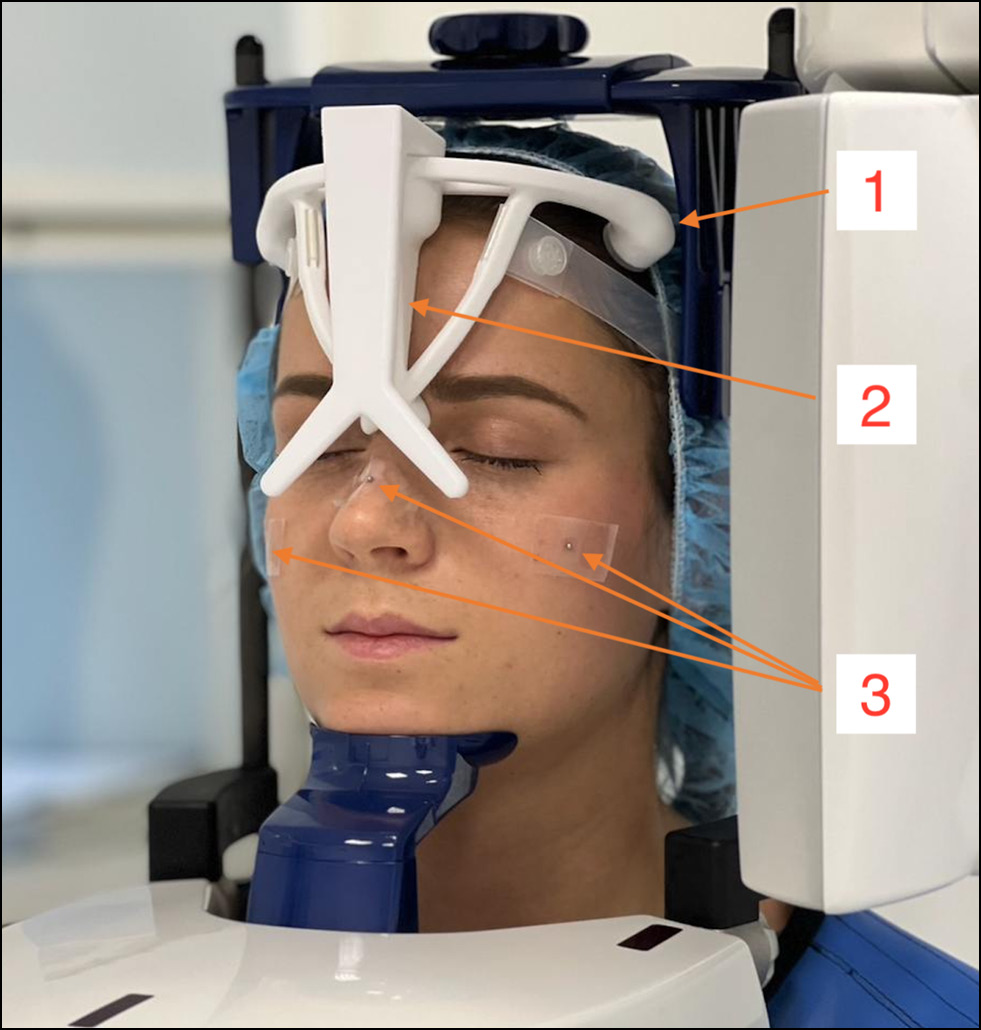 2. Fig. 1. Cone beam computed tomography. 1 — holder; 2 — removable localizer of radiopaque markers; 3 — three metal radiopaque balls on the patient’s face.