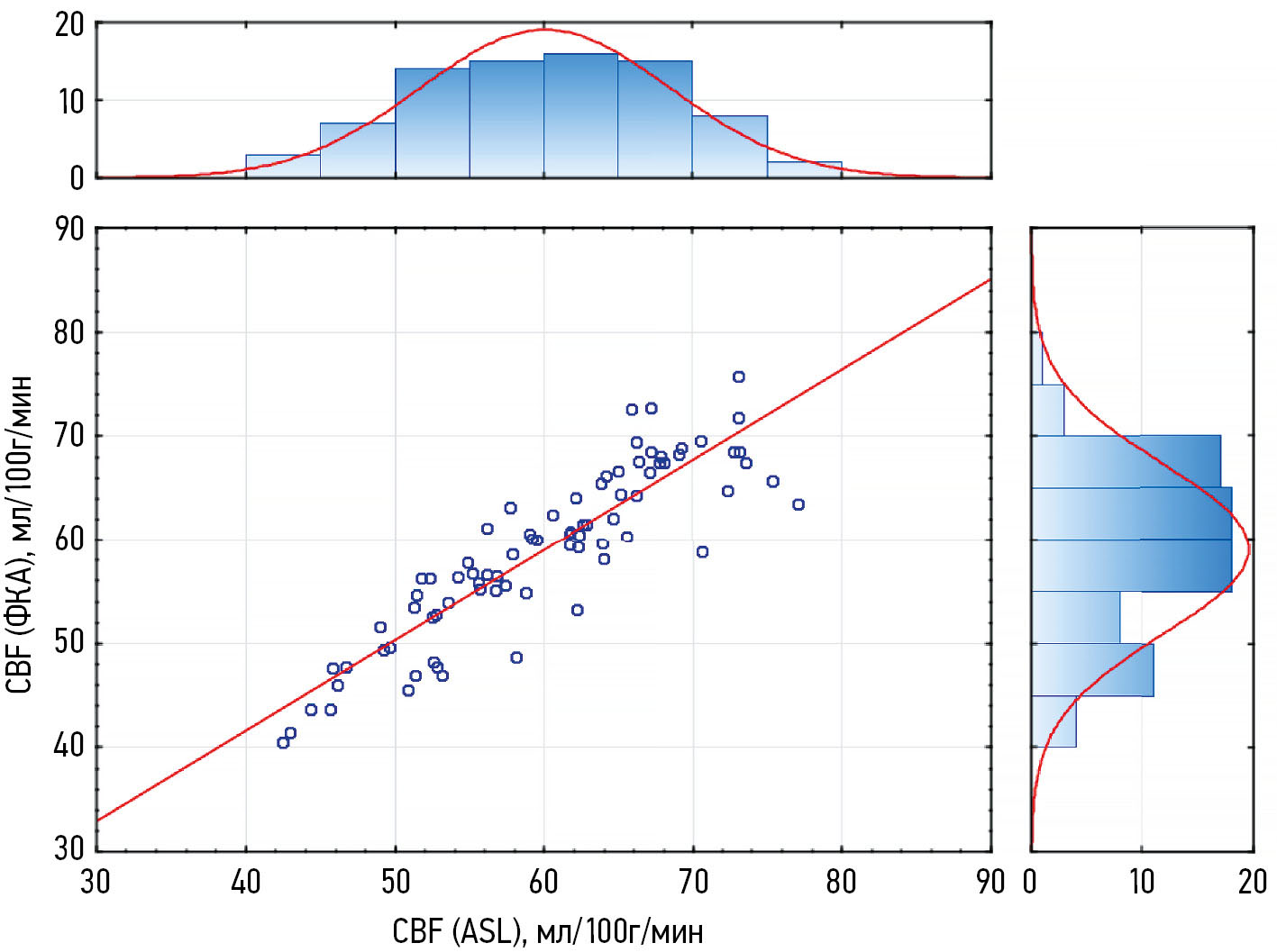 Результаты. Обследованы 80 здоровых взрослых с использованием двух методов. По данным бесконтрастной магнитно-резонансной томографии средние значения перфузии белого и серого вещества головного мозга составили 17,88±2,39 и 42,06±7,13 мл/100г/мин соответственно, показатель общей церебральной перфузии — 59,63±8,56 мл/100г/мин. Общая церебральная перфузия, рассчитанная по данным фазово-контрастной ангиографии и значениям объёмной скорости артериального кровотока, составила 58,96±8,16 мл/с. Обнаружена сильная положительная корреляция значений общей церебральной перфузии, рассчитанных с помощью данных бесконтрастной магнитно-резонансной томографии и фазово-контрастной ангиографии (r=0,892; p <0,001).