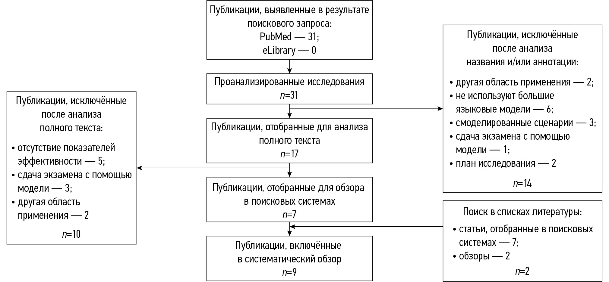 Методы. Провели два варианта поиска — первичный (PubMed и eLibrary), ориентированный на выявление полнотекстовых публикаций с максимально проработанной методологией, и дополнительный (PubMed), направленный на широкий охват сценариев применения больших языковых моделей в лучевой диагностике за период 2023–2025 гг. Извлекали библиометрические данные, формулировку исследовательской задачи, сценарий применения больших языковых моделей, нозологический профиль, ключевые методологические параметры, а также количественные и качественные показатели диагностической эффективности как моделей, так и участвующих специалистов, включая их число и опыт. Качество исследований оценивали с использованием модифицированного опросника QUADAS-CAD.