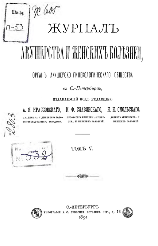 Speech of the Chairman of the Obstetric and Gynecological Society in St. Petersburg, prof. K.F.Slaviansky, pronounced in the annual meeting on January 18, 1891.