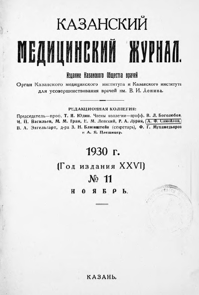 Society of Neuropathologists and Psychiatrists at Kazan State University. Meeting on May 28, 1930 dedicated to the memory of Prof. A. V. Favorsky I. S. Aluf. In memory of prof. A. V. Favorsky. Having noted the main biographical data, the speaker dwells on the characteristics of the deceased's scientific and teaching activities. In the scientific and pedagogical activity of AV, three periods can be distinguished: the first period embraces the time before business trips abroad, the second — overseas business trips, and the third — the time following business trips. The first period includes A. V.'s casuistic works on acromegaly and mercury polyneuritis and his dissertation “Materials on the question of spinal cord compression.