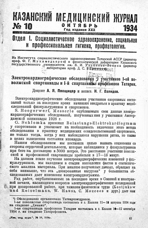Электрокардиографические обследования участников 1-ой поволжской спартакиады и 1-й спартакиады профсоюзов Татарии