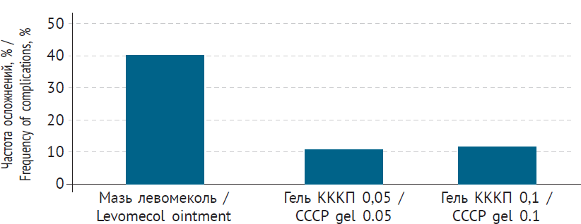 Suppuration frequently occurs when a burn is contaminated with any of a wide range of pathogenic microorganisms (Fig. 2). When CCCPTM gel was used, only two cases (<10 %) experienced a complicated course of the wound process. In comparison, the development of suppurativeinflammation of the dermal wounds was observed in almost 40 % of cases treated with Ointment Levomekol.