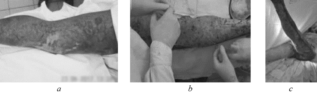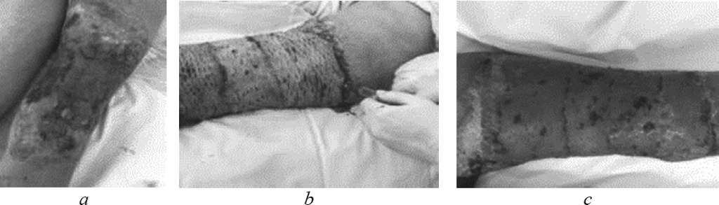 In the second stage of research, MMSCTM at a dose of 0.05 ml/cm2 was used for infiltrative administration into deep burns zones after early necrectomy with simultaneous autodermografting. We present three clinical cases.